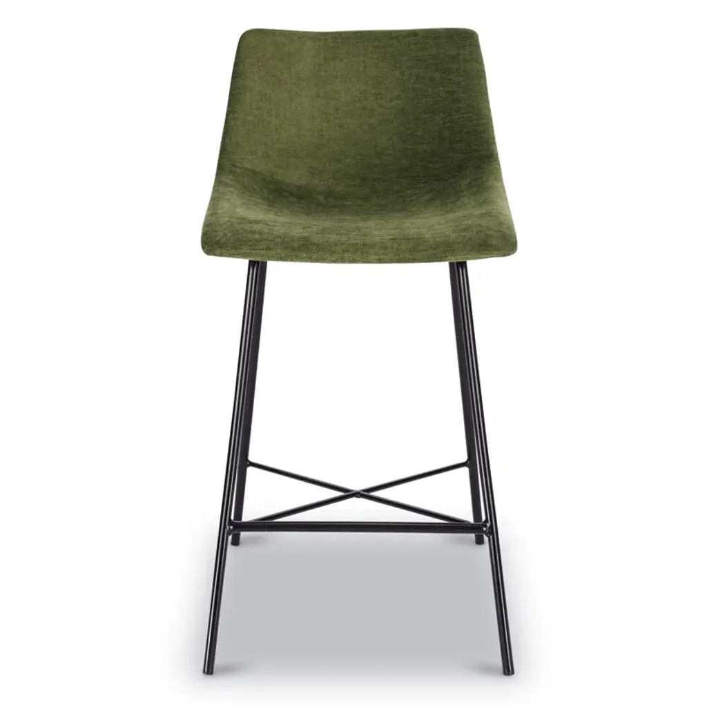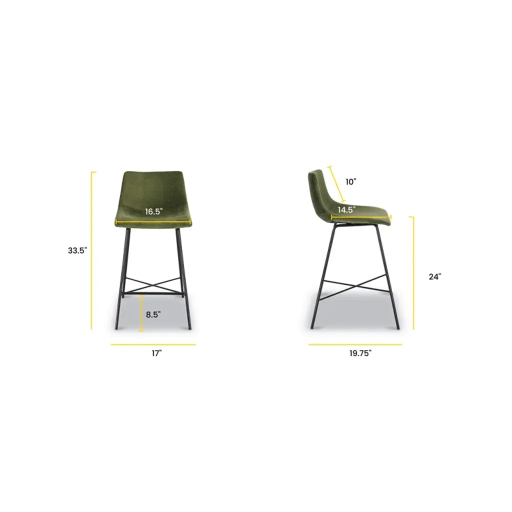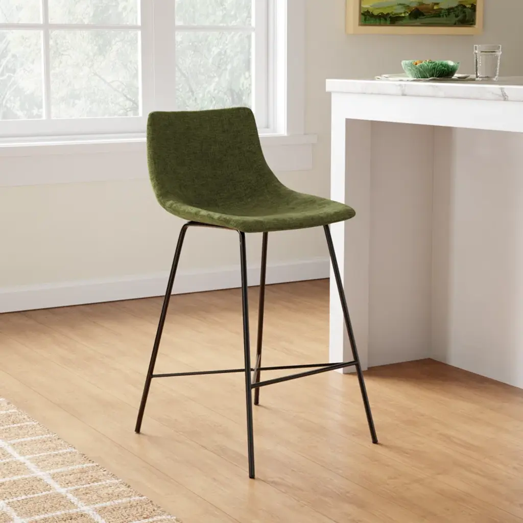 Slide up a seat to your dining table or kitchen island with this sleek counter stool. It rests on two airy + arched powder-coated metal legs with a matte black finish, and it showcases a built-in cross brace on the bottom to support your feet. The mid-century-inspired bucket seat is upholstered in foam-filled velvet upholstery in a weathered green hue for a textured feel while you catch up with friends. Plus, since it comes in a set of three, this trio of stools makes getting a matching look a breeze. These stools accommodate up to 275 lbs.
