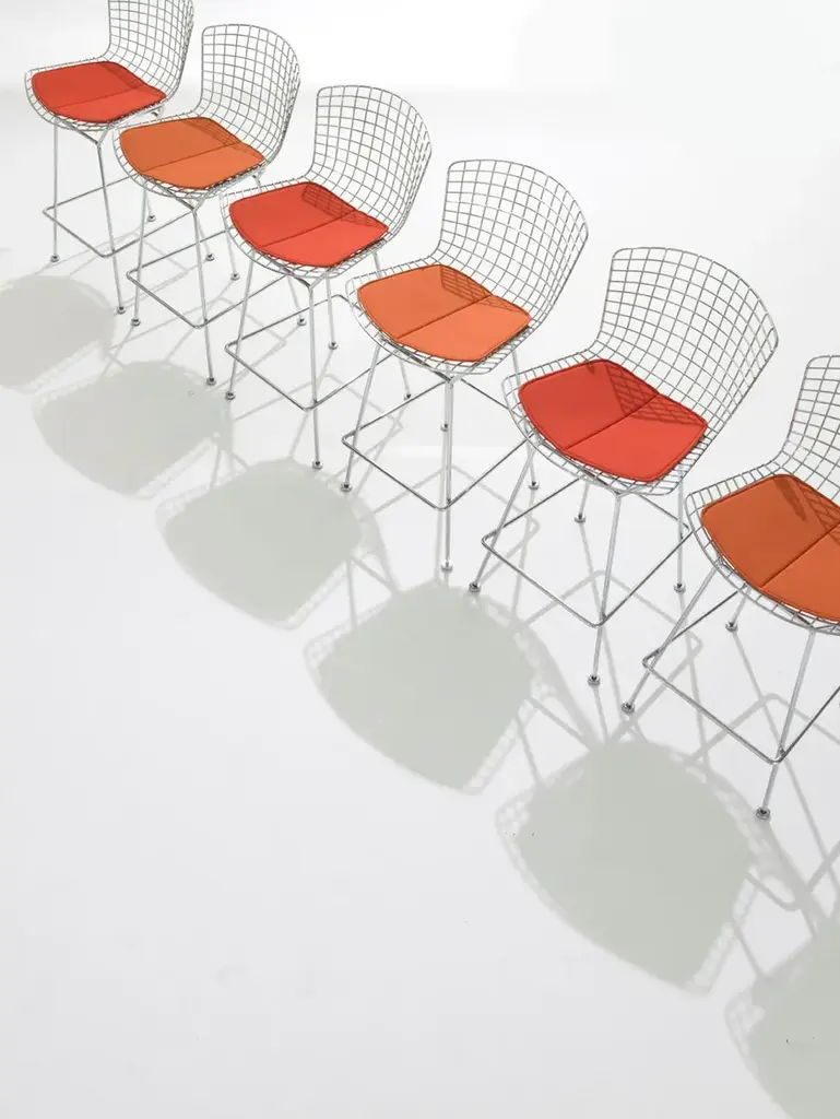 The Bertoia Barstool is part of Harry Bertoia's iconic 1952 wire collection, an astounding study in space, form and function by one of the master sculptors of the last century.Complement your kitchen or café with the quintessential modern barstool. Bar height stools are best paired with tables and counters that are 40-43" high, counter height stools are best paired with surfaces that are 36-39" high.FEATURESBertoia bar stools feature upholstered seat cushions. Back cushions are available on request. The Knoll logo is stamped into the base of the stool.CONSTRUCTIONThe frame is a welded steel construction with rods. Seat cushions secure to chair with lock-snaps.FINISHESThe seat pad is available in a variety of upholsteries.Frame: Polished Chrome, White, Black, Gold