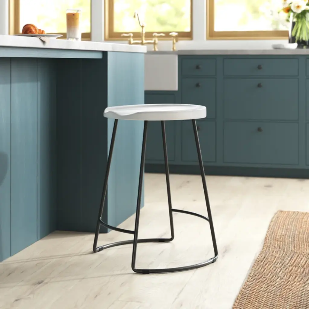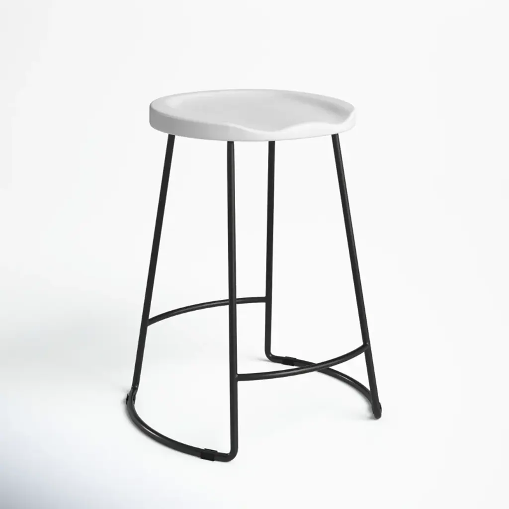 The counter stool features an imprinted wooden seat atop a sleek metal base, making it perfect for kitchen counters.