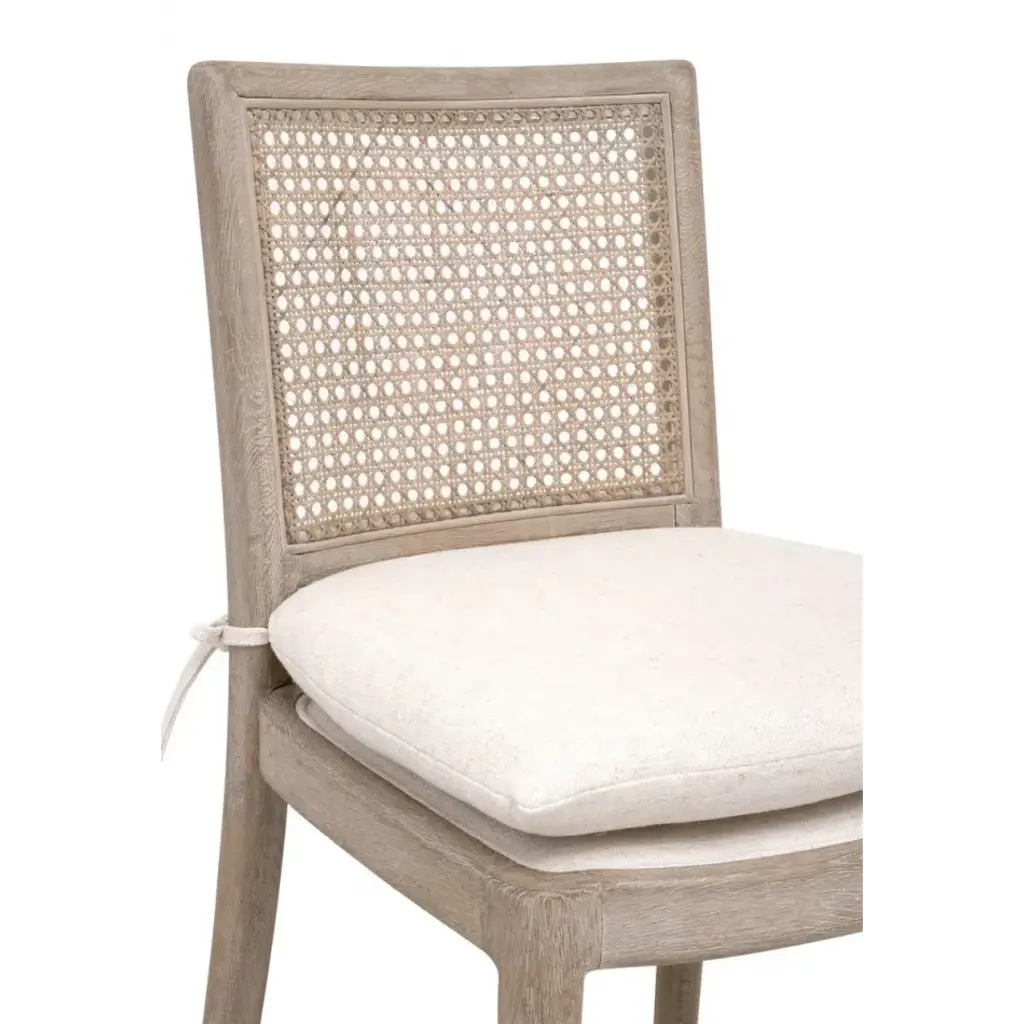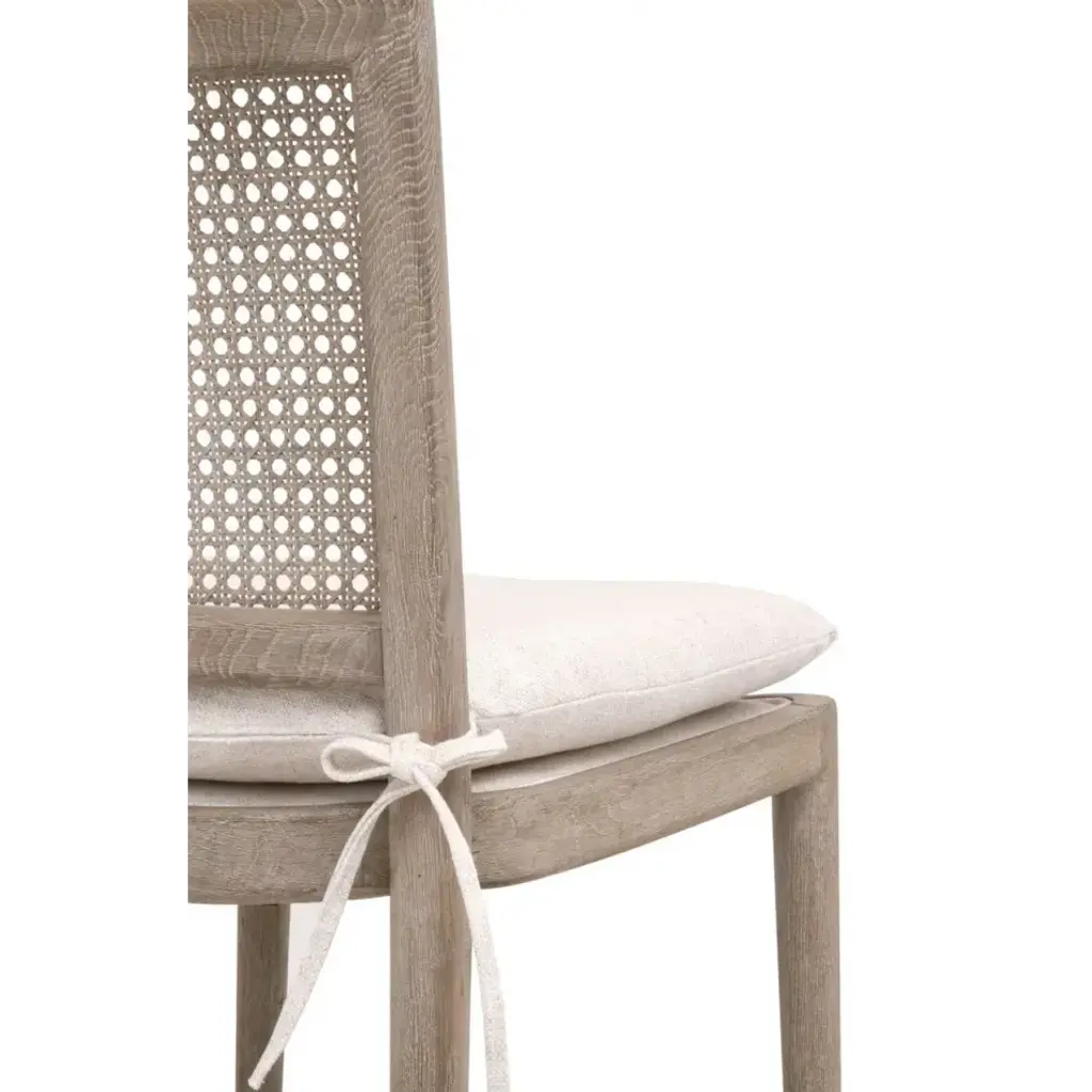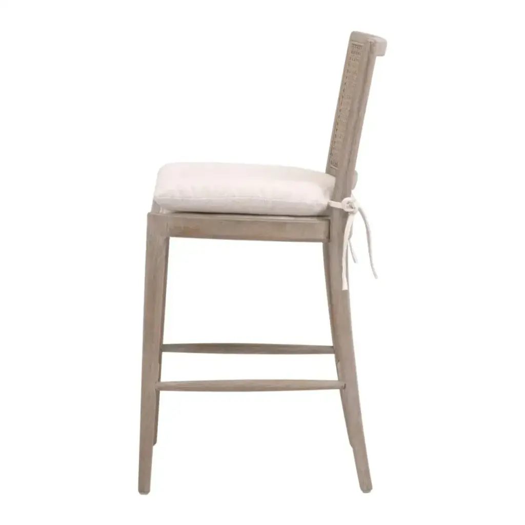 The Blume Counter Stool by Essentials For Living seamlessly combines traditional design with contemporary elements, making it an ideal piece for a transitional space. It measures 18.75" wide, 21.75" deep, and 39.25" high, with a seat height of 26â€. Crafted with a natural gray solid oak wood frame and cane back, it provides an airy, stylish aesthetic. The seat cushion is removable with ties and upholstered in a performance textured cream linen. This material is made from a durable polyester-linen blend that is stain-resistant and designed to withstand everyday use. With a contoured seat and leg stretchers for added support, this transitional stool delivers both comfort and durability, making it a refined addition to any bar or dining space.