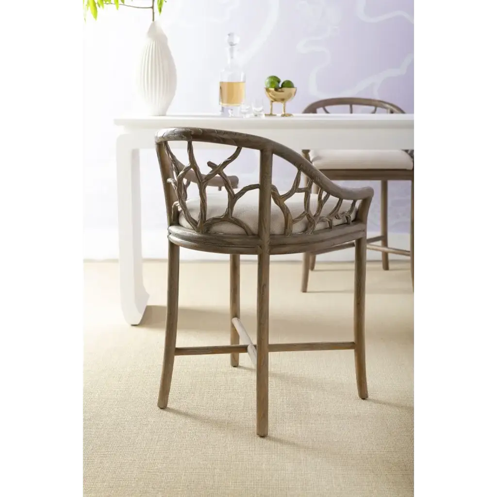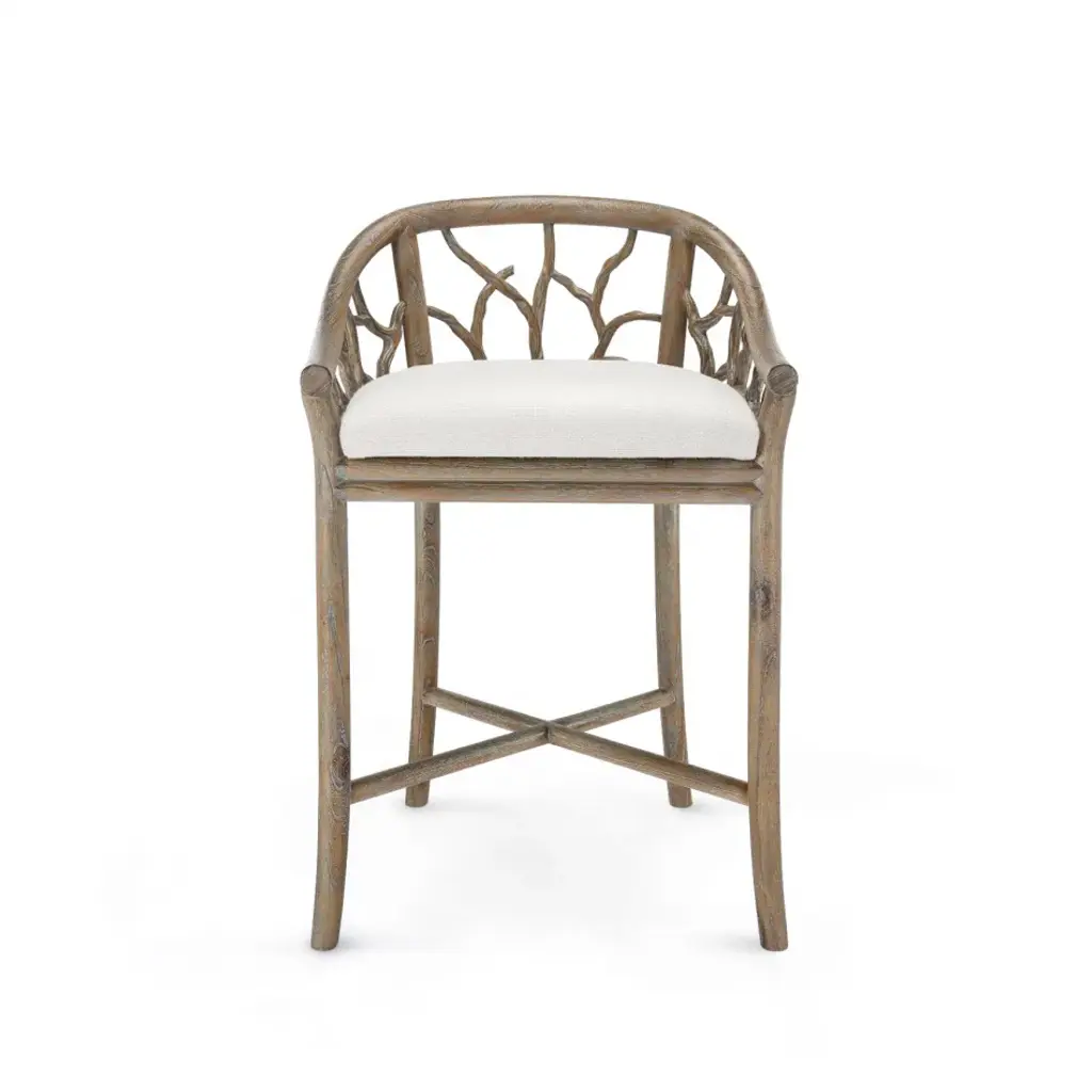 Whether you’re outfitting a cozy country cottage, beachside villa, or eclectic urban loft, add a touch of woodland whimsy to your space with our Bosco collection. An updated expression of classic French faux bois design, in which natural tree-like features of bark and branches are brought to hyperrealistic realization, our Bosco Counter Stool features a hand-carved silhouette of solid Cape Lilac Mahogany, intricately crafted to resemble a magical swirl of twigs. The gorgeously rustic elements are refined by a light driftwood finish, along with a plush linen drop-in cushion for a luxe, comfortable seat.