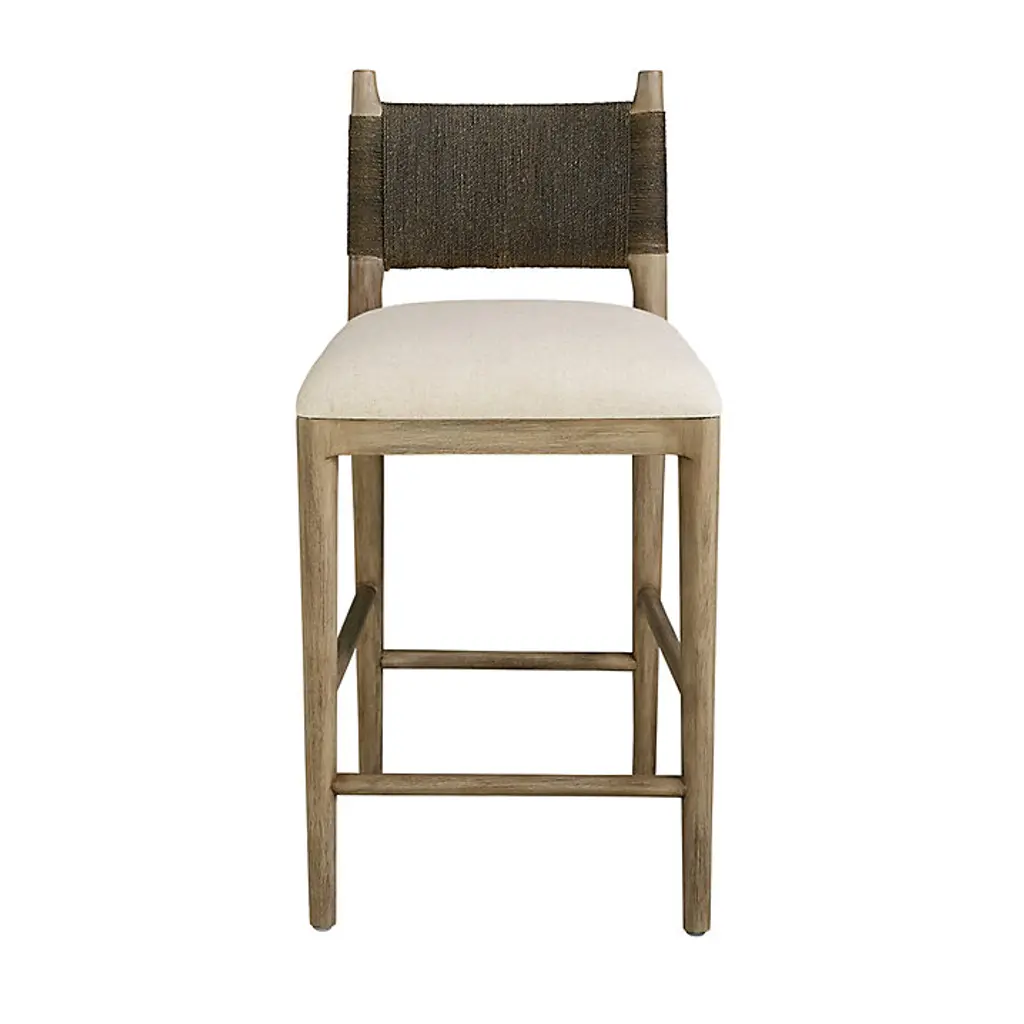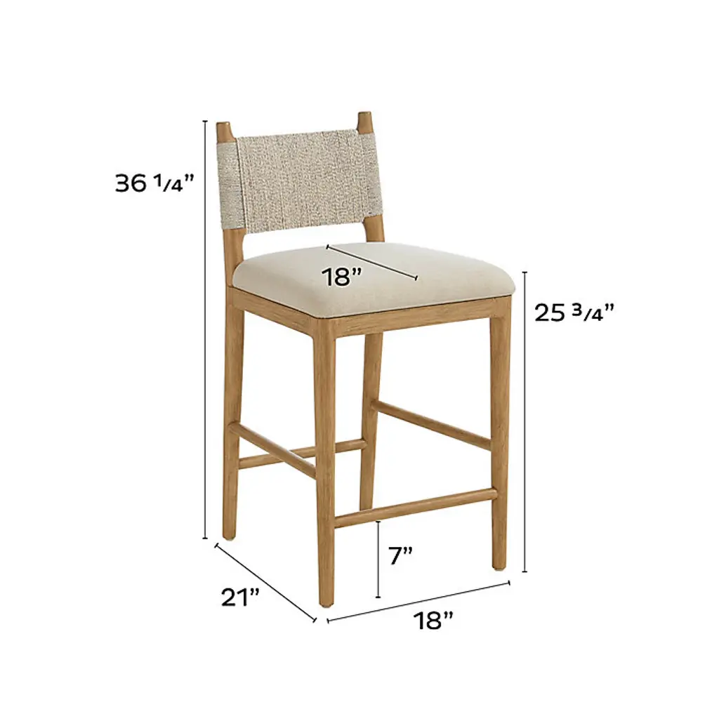 Our Bridget Counter Stool offers a stylish blend of unexpected textures. It's comfortably canted backs is hand woven in double seagrass rope. Deeply padded seats are upholstered in a linen blend fabric and removes for easy recovering. We recommend our stylish, washable Performance Fabrics for spill-prone areas like the dining room, eat-in kitchen and breakfast nooks. The clean-lined frames are artisan crafted of solid mahogany with floating joints for enduring strength, and hand finished in warm stain to bring out the wood's rich grain. This fashionably unconventional counter stool transitions easily from classic to modern kitchen decors.Bridget Counter Stool features:
