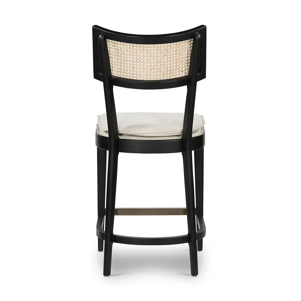 Mixed materials refresh retro styling. Brushed ebony nettlewood frames a textural inlay of natural cane for beautifully crisp contrast. Fastened by Velcro, light, linen-blend seating of high-performance fabric brings modern sensibility to the counter. Performance fabrics are specially created to withstand spills, stains, high traffic and wear, ensuring long-term comfort and unmatched durability. Ships In 10-14 Business Days Brass kickplate Natural cane back Performance fabric This image is for illustrative purposes only. The colors shown are accurate within the constraints of lighting, photography, and the color accuracy of your screen.