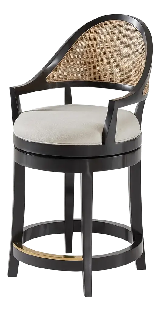 Mixed materials refresh retro styling. Brushed ebony nettlewood frames a textural inlay of natural cane for beautifully crisp contrast. Fastened by Velcro, light, linen-blend seating of high-performance fabric brings modern sensibility to the counter. Performance fabrics are specially created to withstand spills, stains, high traffic and wear, ensuring long-term comfort and unmatched durability. Ships In 10-14 Business Days Brass kickplate Natural cane back Performance fabric This image is for illustrative purposes only. The colors shown are accurate within the constraints of lighting, photography, and the color accuracy of your screen.