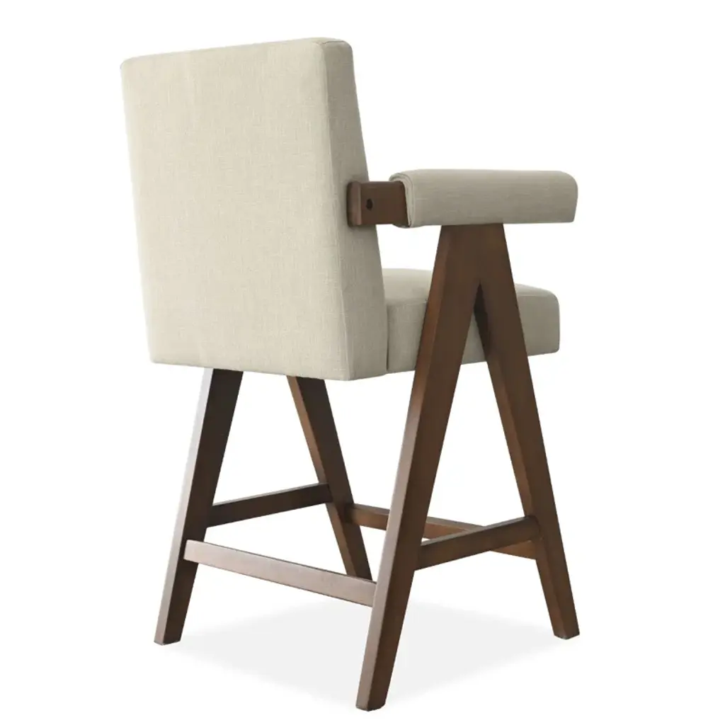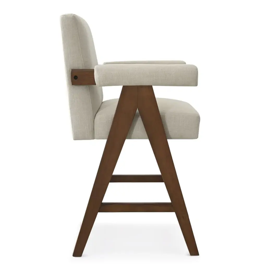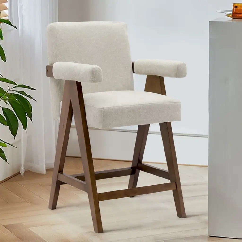 Bring extra seating to your kitchen island or home bar with this modern bar stool. Its open and airy frame is crafted from solid wood with a warm walnut finish, and it rests on V-shaped legs that highlight your space. This stool with arms comes with a spacious back and seat that are wrapped in a polyester blend with a neutral hue, so it's sure to bring texture wherever you place it. Foam filling inside offers lots of cushioned support while you perch. We also like that it features a built-in footrest for even more comfort. This stool accommodates up to 300 lbs.