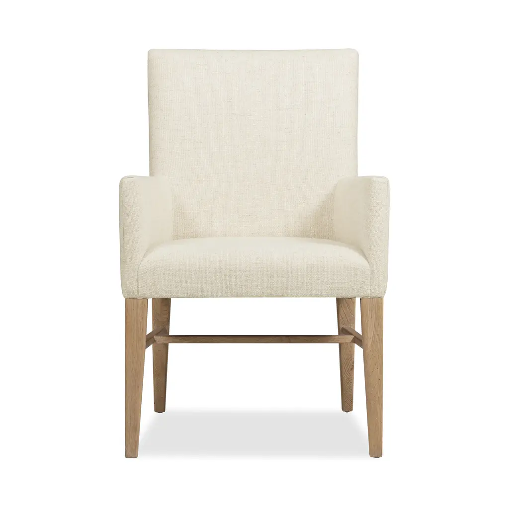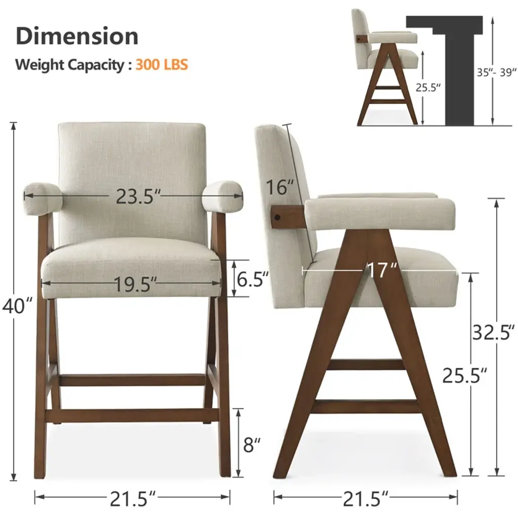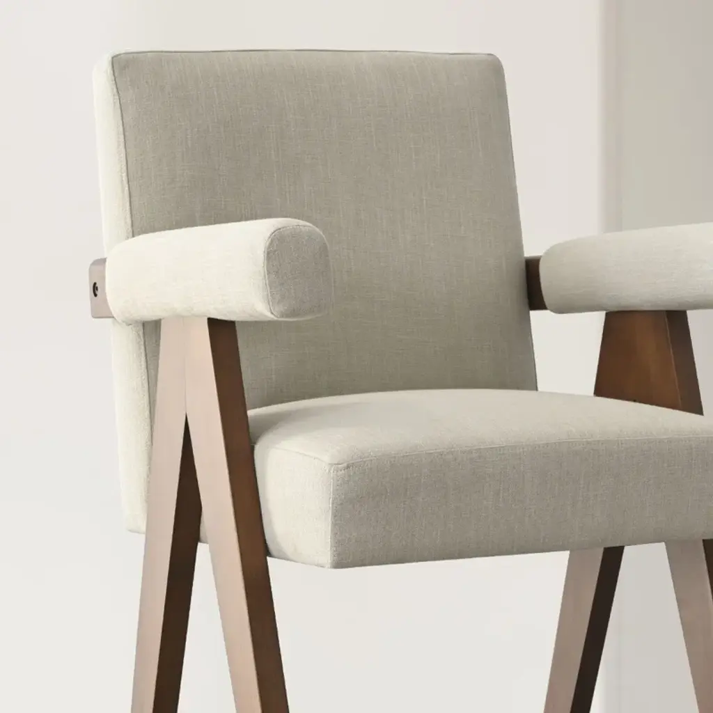 Bring extra seating to your kitchen island or home bar with this modern bar stool. Its open and airy frame is crafted from solid wood with a warm walnut finish, and it rests on V-shaped legs that highlight your space. This stool with arms comes with a spacious back and seat that are wrapped in a polyester blend with a neutral hue, so it's sure to bring texture wherever you place it. Foam filling inside offers lots of cushioned support while you perch. We also like that it features a built-in footrest for even more comfort. This stool accommodates up to 300 lbs.