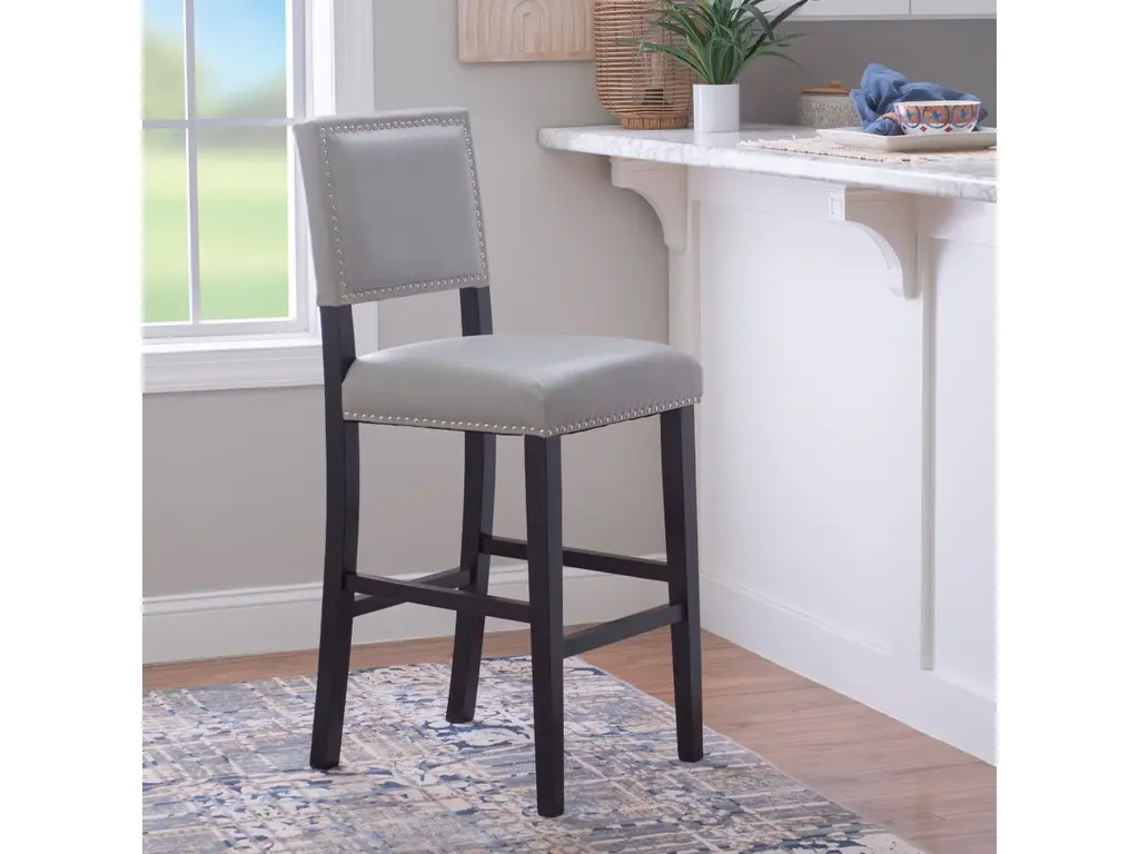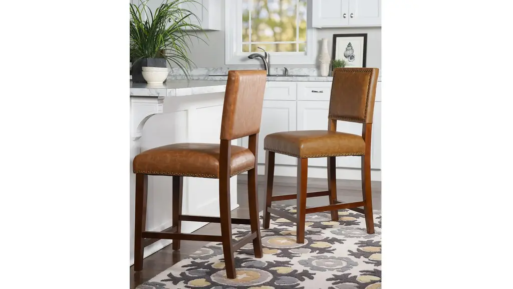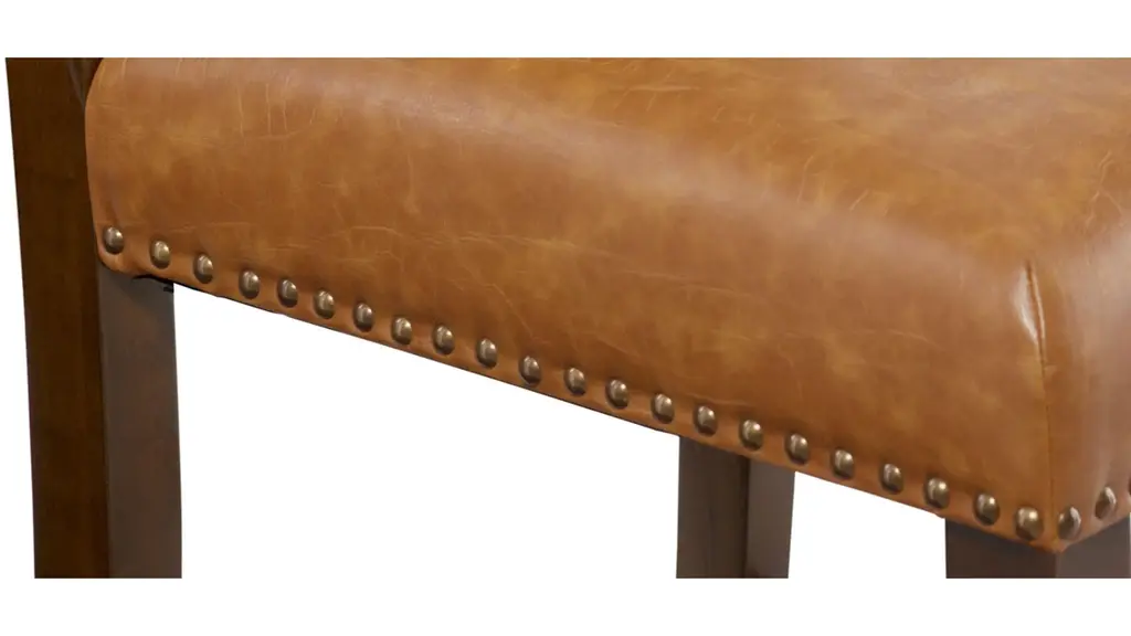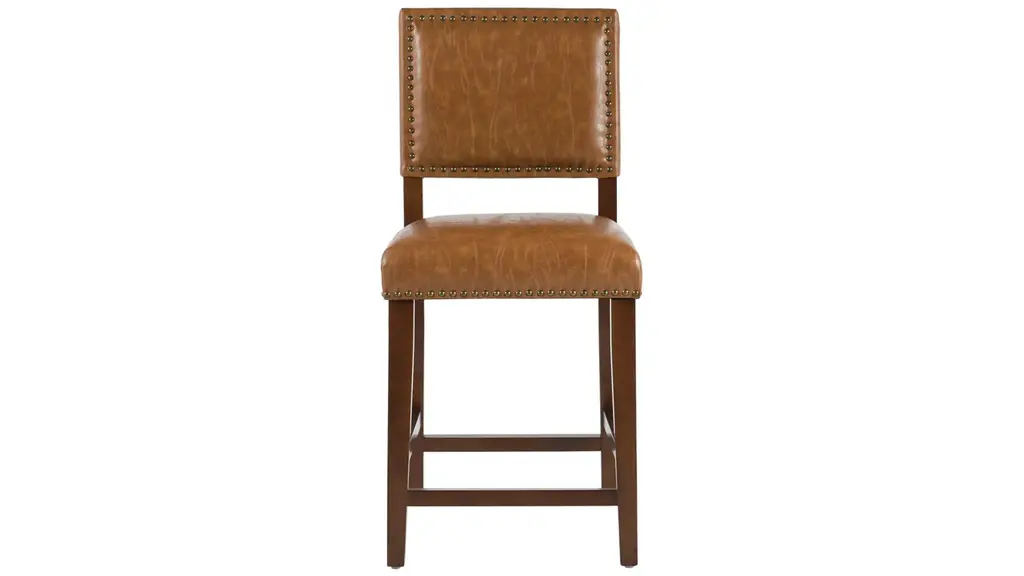 Create a contemporary or classical look in your kitchen, dining or home pub area with the sleek shape and style of this medium walnut finish 24" Brook Counter Stool. Solid wood legs give this courtly stool additional strength ensuring years of everyday use. The padded cushion and seat back provides optimum comfort for you and your guests and is topped with durable caramel colored vinyl that is stain resistant, fade resistant and features tightly woven threads that won't break, mat or peel. Classic nail head trim accents the stools lines. 275 pound weight limit.