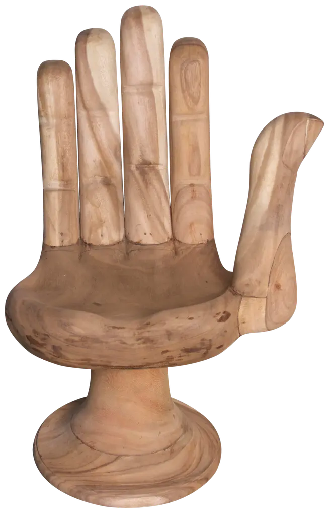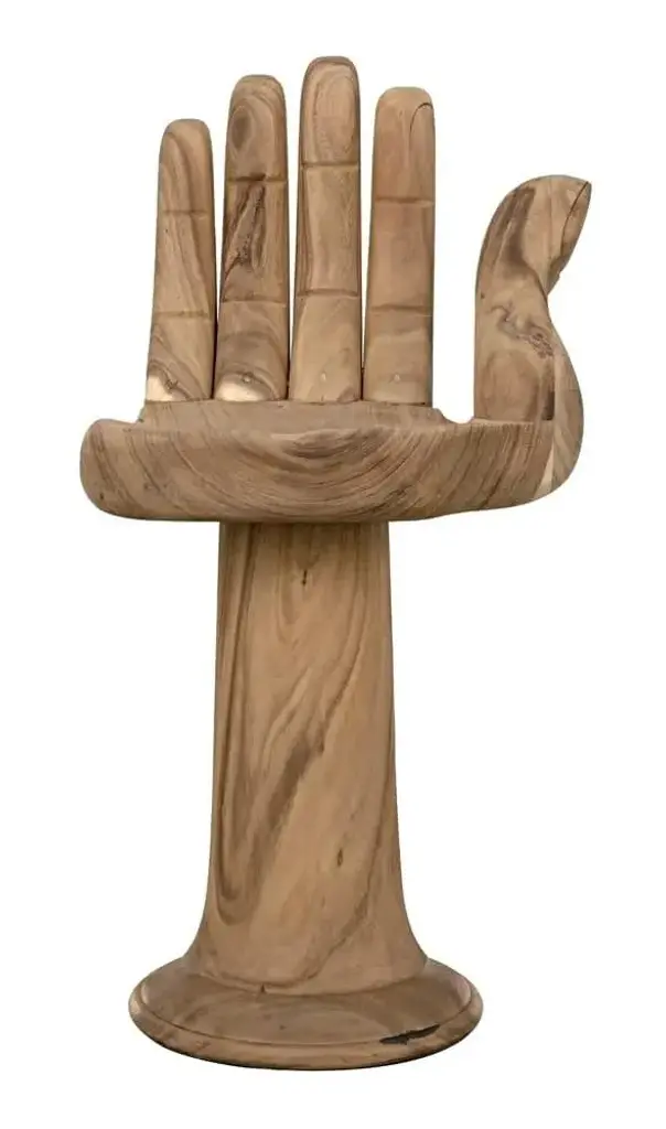 Buddha means "enlightened" and our hand-carved teak seating embodies this goal. A literal representation of the protection asana (pose), the raised, open hand symbolizes a shield, signifying courage and offering protection from fear, delusion, and anger. Here, the dynamic grains and varying tones of teak wood are highlighted in a hand carved stool, available in both counter and bar heights.