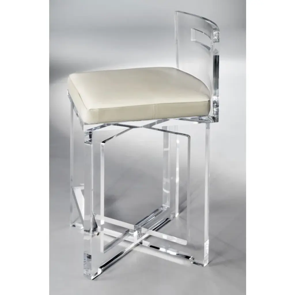Easily elevate the look of your kitchen with this leather and acrylic counter stool. The beauty of this counter stool is allowed to shine through its design, featuring acrylic legs, a soft seat and metallic trim and foot rest, gives your room an airy glamourous appeal. The neutral hue of the upholstered top works in many aesthetics.