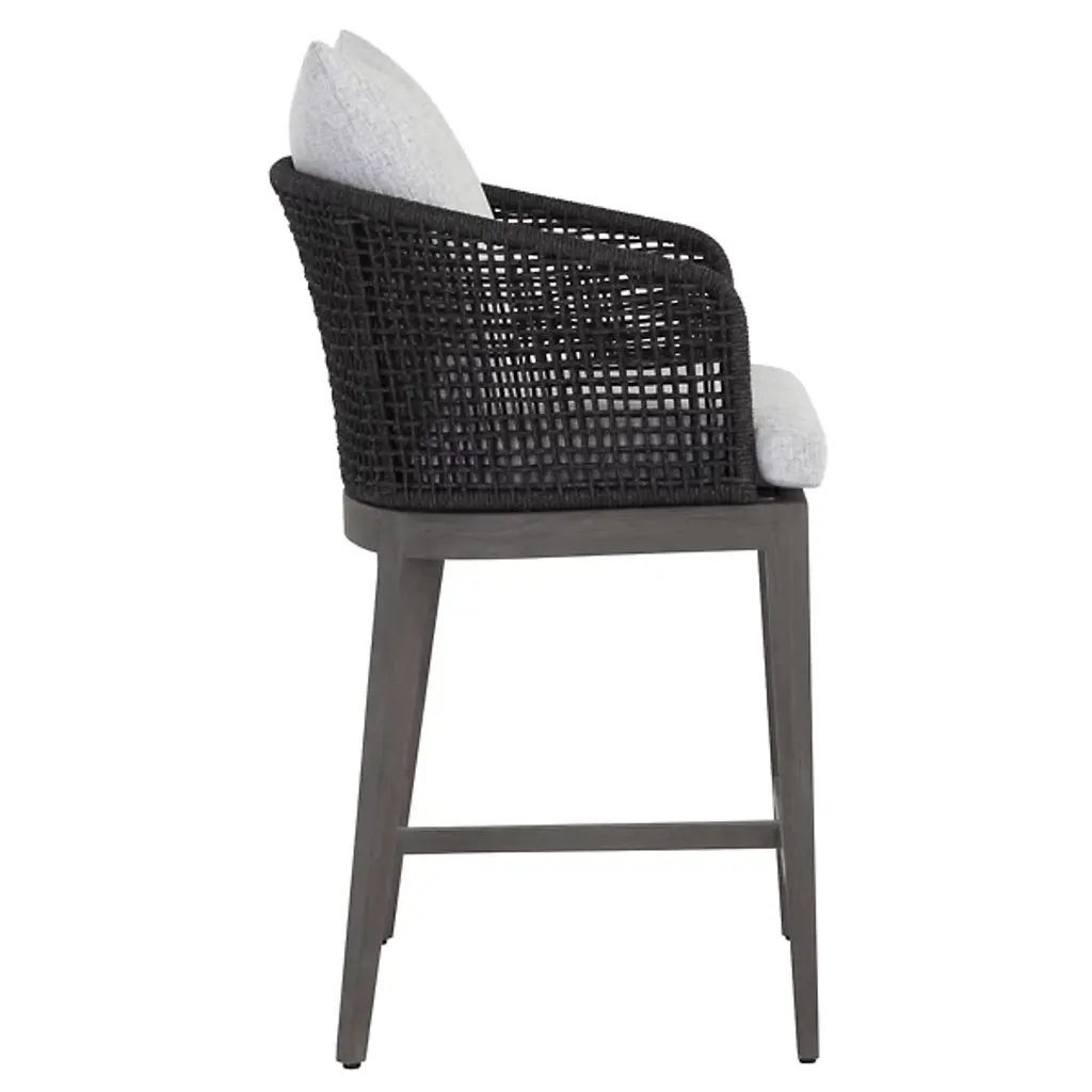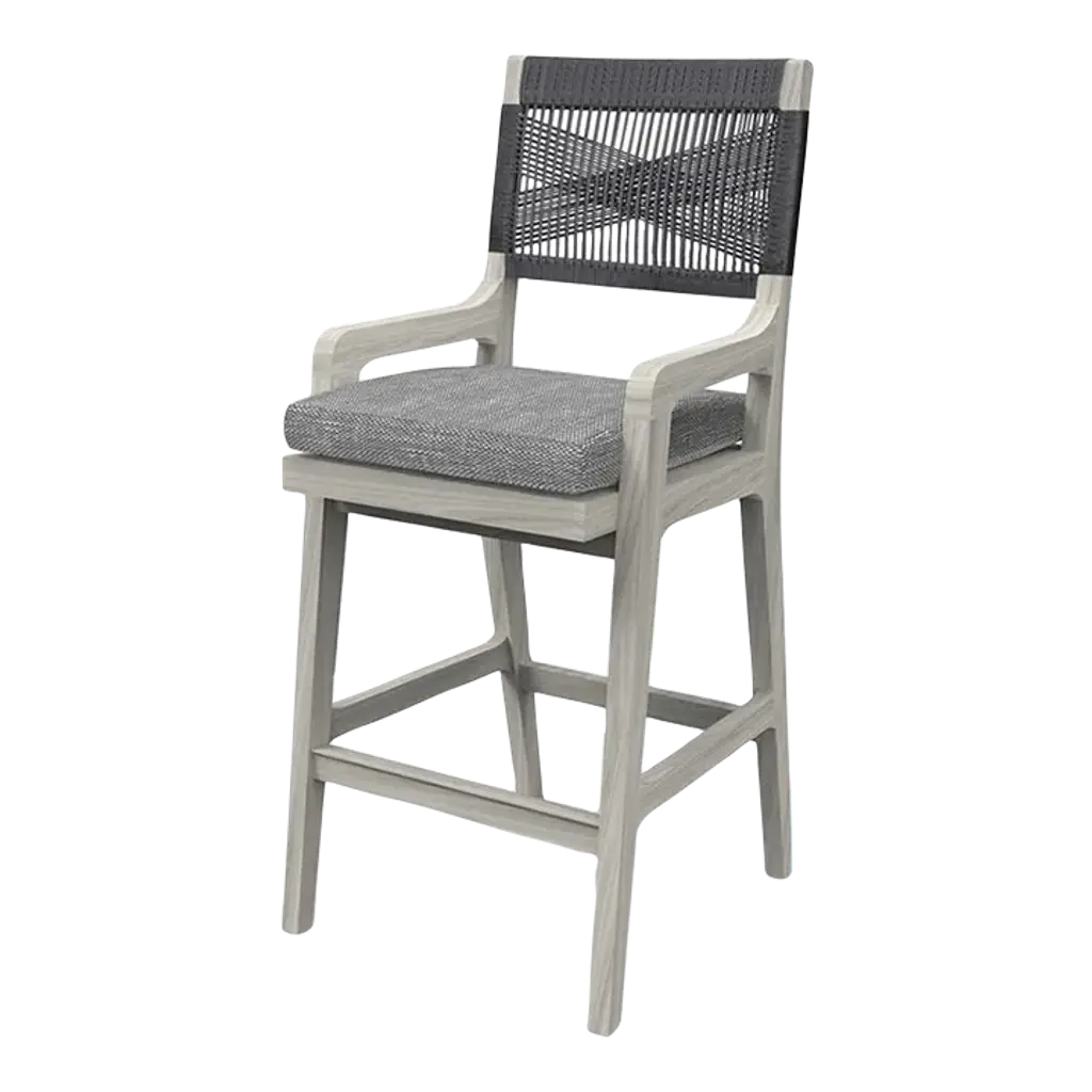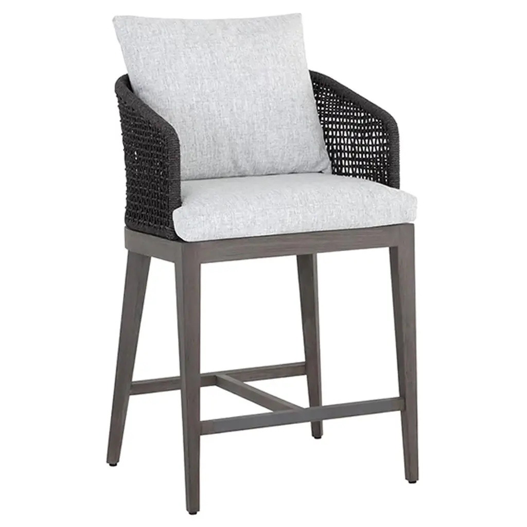 Experience indoor-outdoor comfort with the Capri Outdoor Counter Stool by Sunpan, a stunning addition to any setting. This inviting stool boasts a barrel back frame enveloped in a mix weave, perfectly paired with seat cushions in strong grey fabric for ultimate comfort. Anchored by a natural teak wood base that develops a charming silver-grey patina over time, this stool is designed to withstand outdoor elements with its high oil content. Handwoven with meticulous craftsmanship and equipped with weather-resistant, UV-protected cushions filled with Urecel QuickDry Foam, this stool effortlessly combines Coastal, Nautical, and California Modern styles, offering both durability and sophistication.