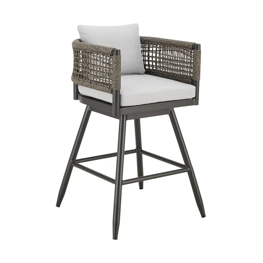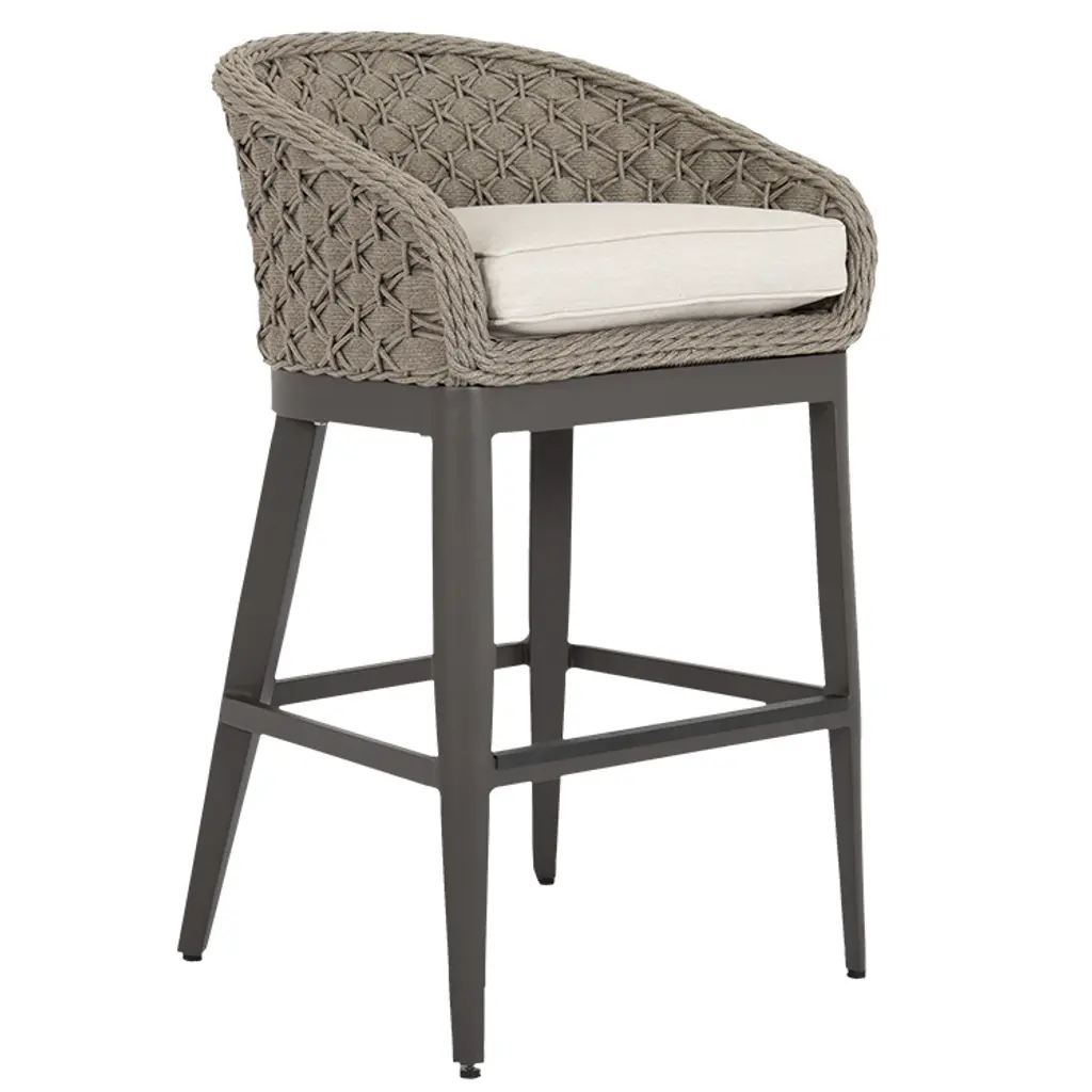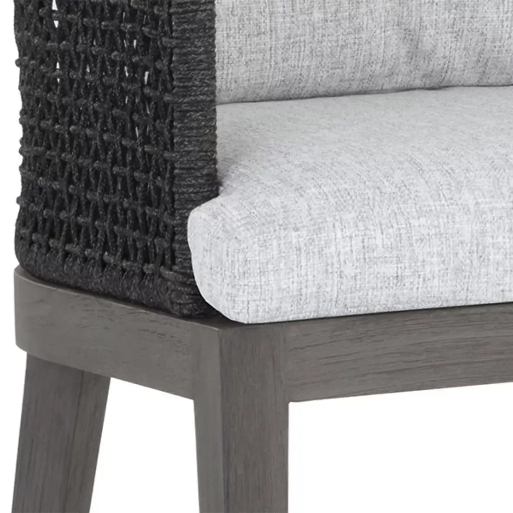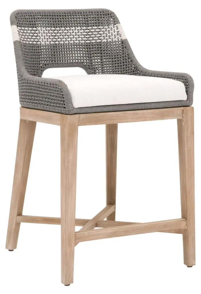 Experience indoor-outdoor comfort with the Capri Outdoor Counter Stool by Sunpan, a stunning addition to any setting. This inviting stool boasts a barrel back frame enveloped in a mix weave, perfectly paired with seat cushions in strong grey fabric for ultimate comfort. Anchored by a natural teak wood base that develops a charming silver-grey patina over time, this stool is designed to withstand outdoor elements with its high oil content. Handwoven with meticulous craftsmanship and equipped with weather-resistant, UV-protected cushions filled with Urecel QuickDry Foam, this stool effortlessly combines Coastal, Nautical, and California Modern styles, offering both durability and sophistication.