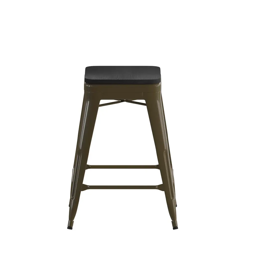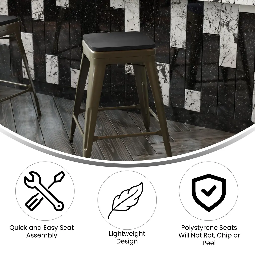 Add exciting furniture to your eatery, kitchen, or dining room with these colorful metal counter stools. These industrial style stools conform in modern and traditional spaces. Lower support braces double as a footrests, and floor glides protect your floor by sliding smoothly when you need to move these stools. These classic metal stools look extraordinary when matched with the included colorful polystyrene seats that won't rot, chip, or peel. These bistro stools offer a chic option in contrast to conventional wood seating and are built for indoor use. These space-saving stools with tapered frames stack up to 10 high for storage. Plastic bumper guards protect the seats while the stools are stacked. The poly resin seats attach to the preassembled seats in minutes and cleanup is easy with water and a neutral detergent.
