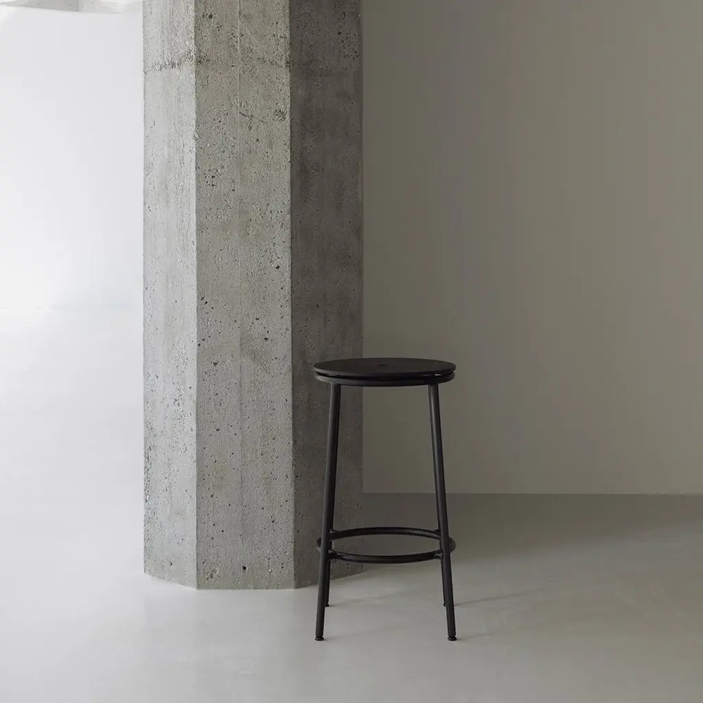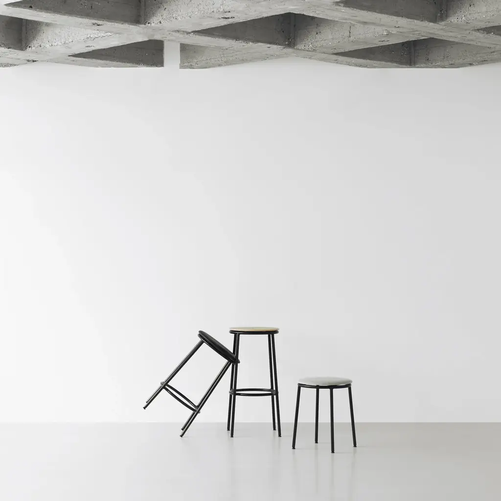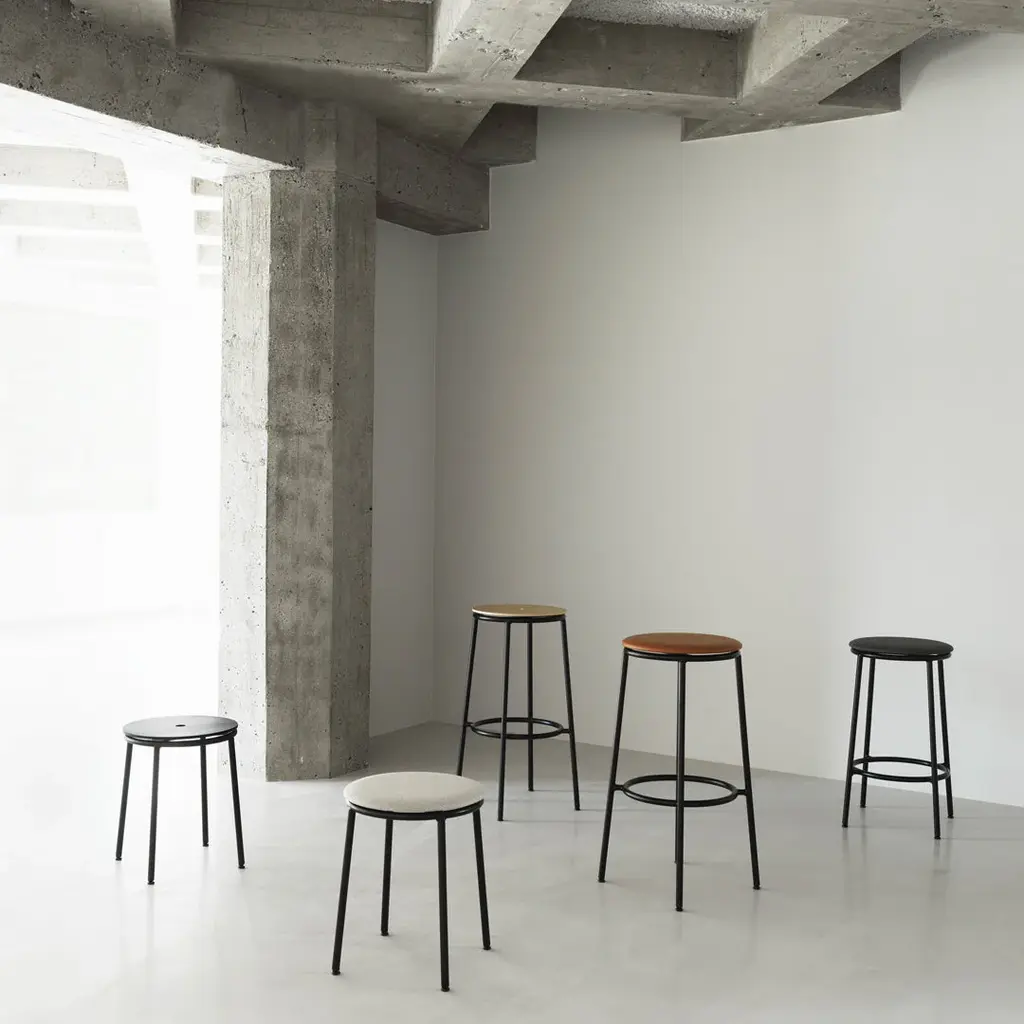 The Circa stool is a minimalistic and timeless stool comprising a steel tube frame and an oak veneer, aluminum or upholstered seat available in either textile or leather. The circular seat rests on a slender steel base in black powder steel. Available in three different sizes, Circa offers a timeless stool suitable for bars, kitchen islands, or extra seating by the dinner table.
