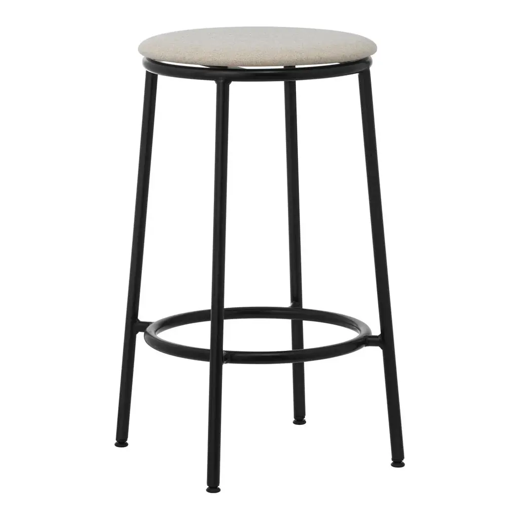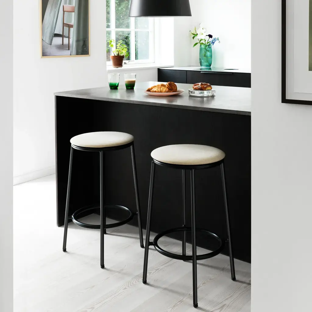 The Circa stool is a minimalistic and timeless stool comprising a steel tube frame and an oak veneer, aluminum or upholstered seat available in either textile or leather. The circular seat rests on a slender steel base in black powder steel. Available in three different sizes, Circa offers a timeless stool suitable for bars, kitchen islands, or extra seating by the dinner table.
