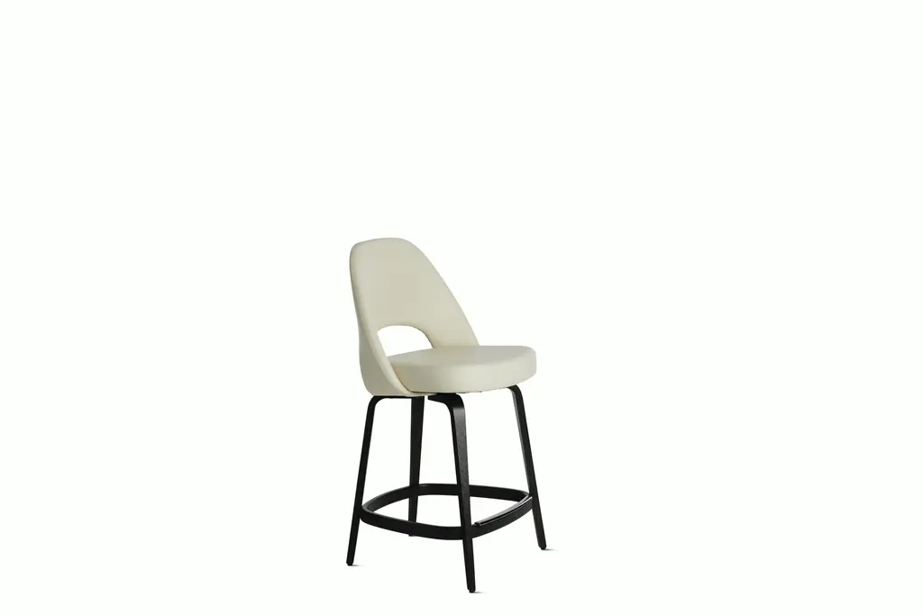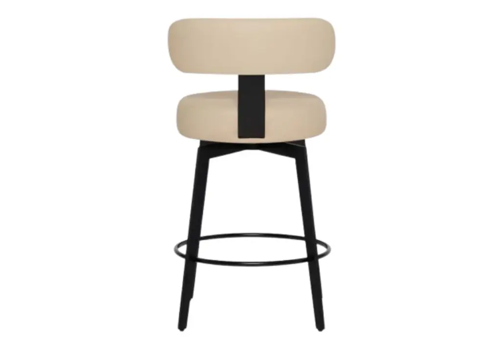 This counter stool features a matte black stainless steel frame complemented by a cream latte vegan leather upholstery. Its tasteful design styles well in kitchen and dining rooms, giving a refined touch.