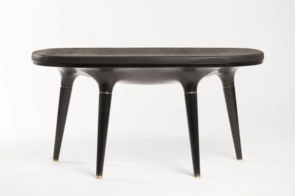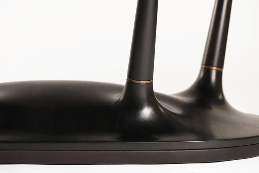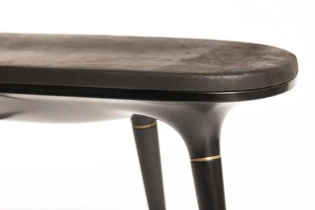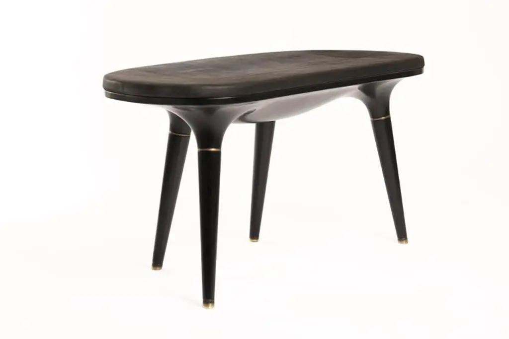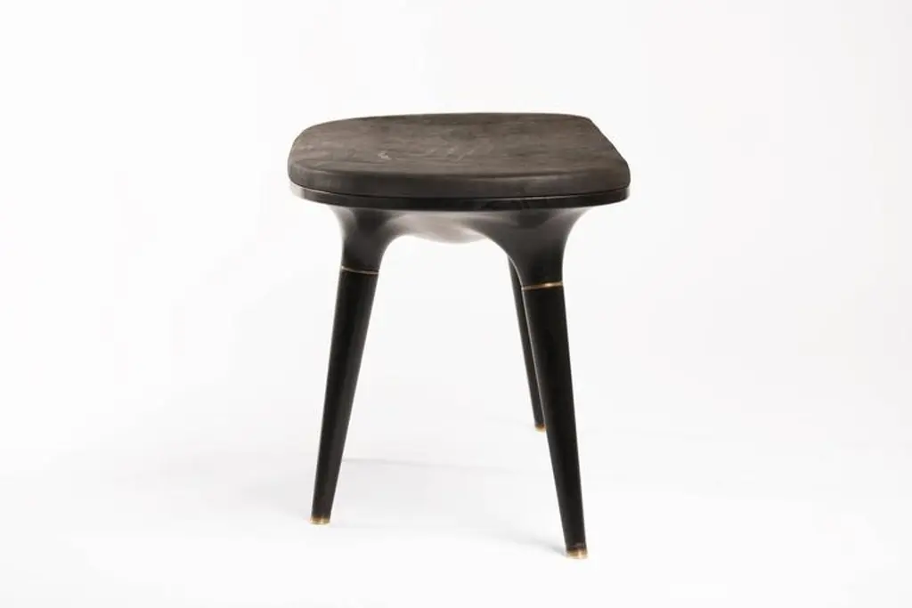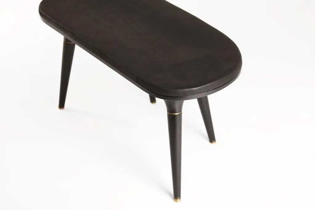 Ebonized Bench001 from series 001 by Vincent Pocsik.Carved walnut bench with leather cushion top and brass accents. Shown here in ebonized finish.Vincent Pocsik finds the balance between old and new fabrication techniques working in conjunction to find an anatomical form that creates its own presence. Series 001 is about finding that point in each piece, personifying it, letting it find itself in the scale and figure, then stopping it at the place where it seems most stabile. All furniture pieces are made inside his shop in Los Angeles. All glass, metal and upholstery work is done with local Los Angeles craftsmen.Dimension:36” L x 18" x 18” H - Custom sizing available for: counter stool, bar stool and floor stool.