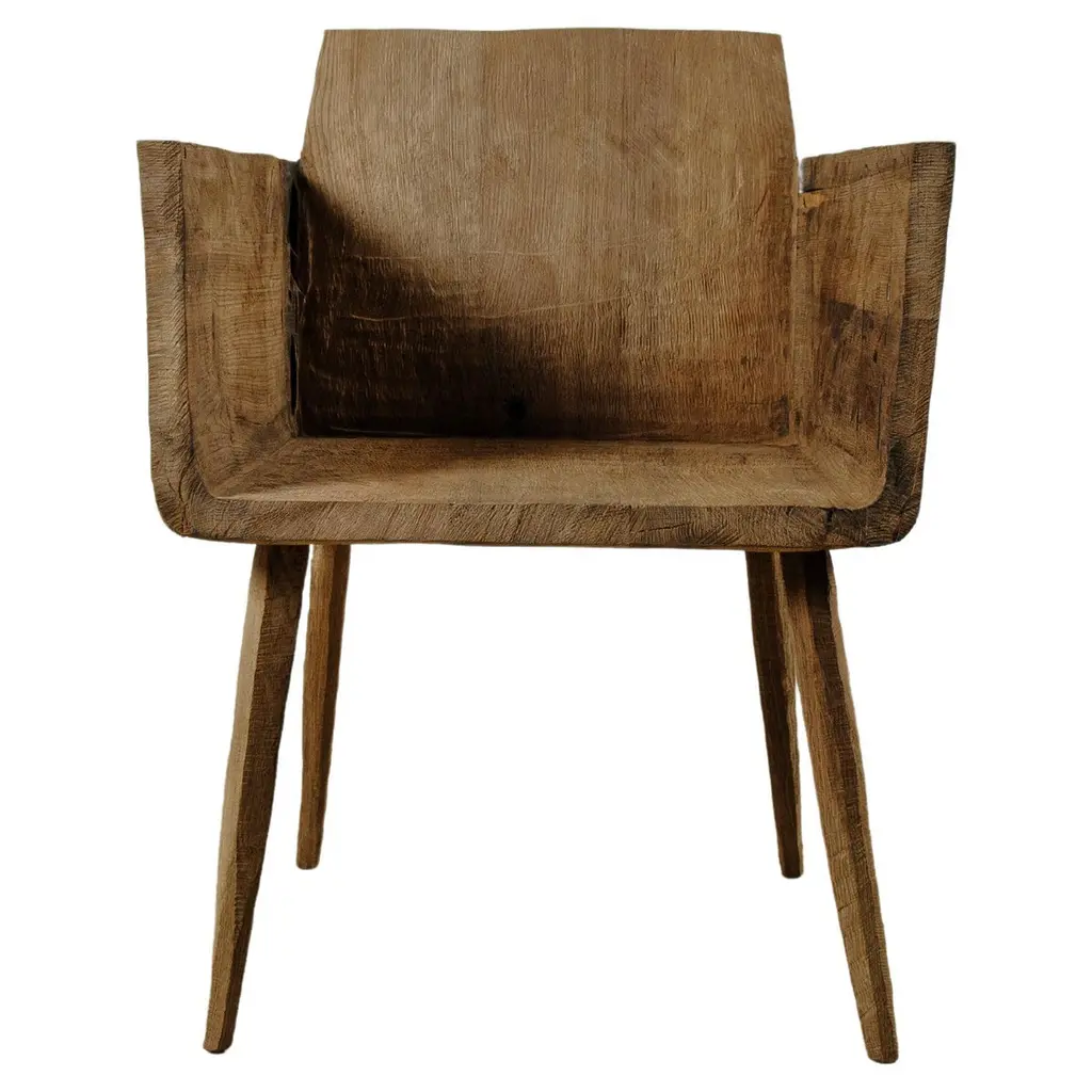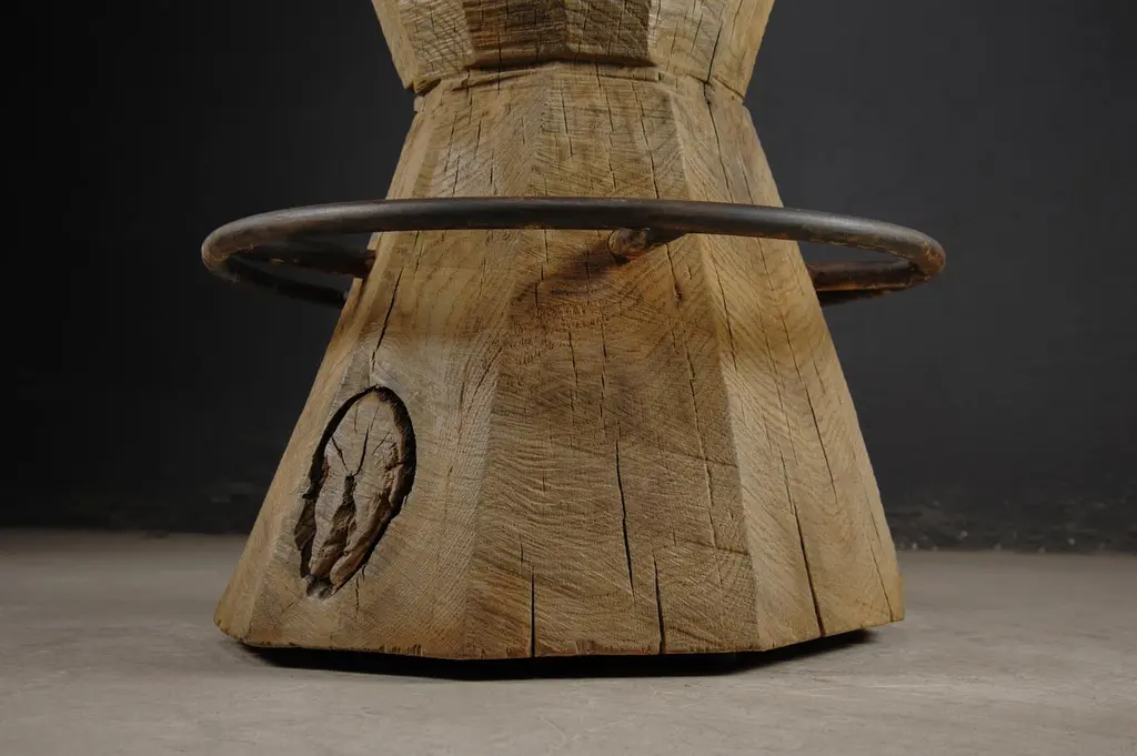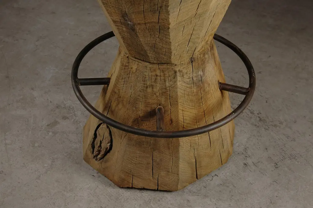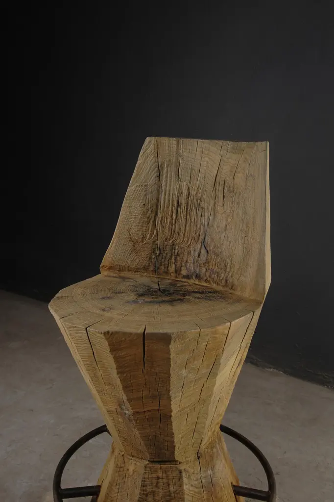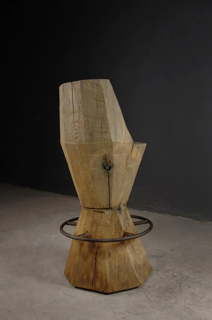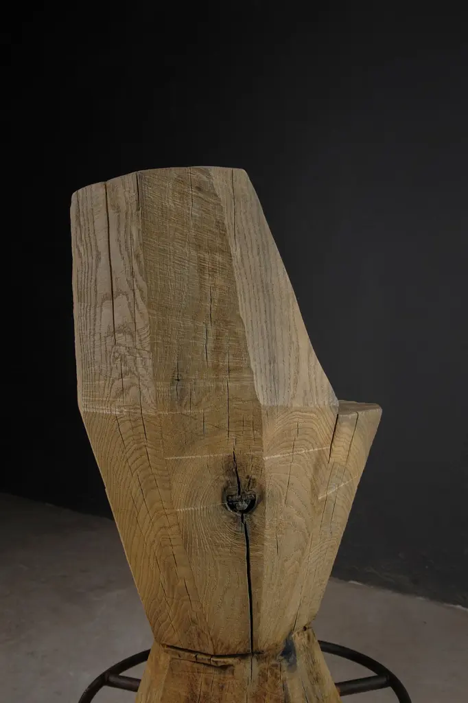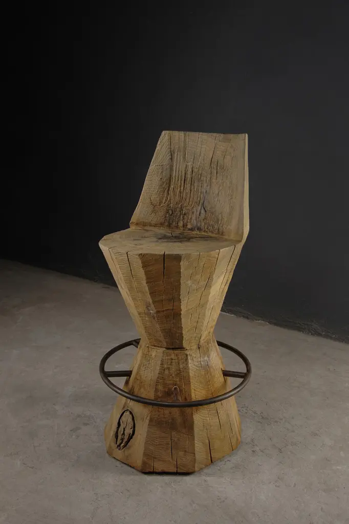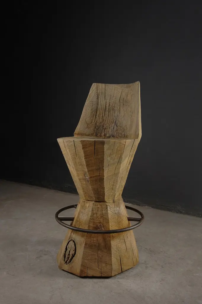 Contemporary Massive Counter Stool in Solid Oak Wood by Denis MilovanovDimensions : H. 100 x W. 35 x D.40 / SH. 70 cmCustomizableSÓHA design studio conceives and produces furniture design and decorative objects in solid oak in an authentic style. Inspiration to create all these items comes from the Russian North aesthetics with its severe nature, log huts black from time and climate and scant patterns. Wood is masterfully hand processed with chainsaw or chisel, whereby producing beautiful surface patterns. The wood is soaked in boiling baths of linseed oil, creating this special patina and making each creation a very unique piece. Reacting with tanning substances under high temperature, oil gives the objects expressive and natural colours, from light brown to charcoal-black. SÓHA offers a vast array of neo-primitivist interior objects. Our kitchen utensil, wall panels, sculptures and furniture solutions are executed in one unique style and will organically fit into the interior of your home. Each piece is one-of-a-kind handmade product.Unique piece made to order.
