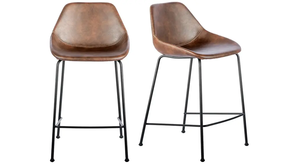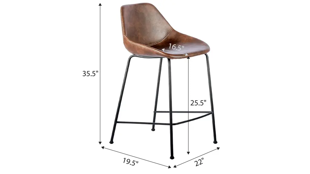 The Corinna Counter Stool combines a rich, distressed leatherette seat and back with a contemporary silhouette. This stylish and versatile stool has baseball stitching accents on the seat and a strong and flexible base is made of solid round matte black steel.