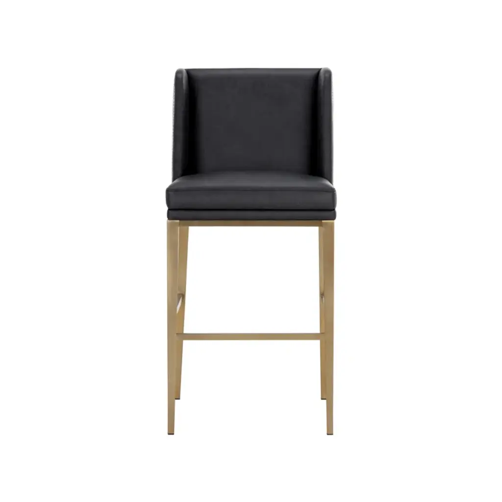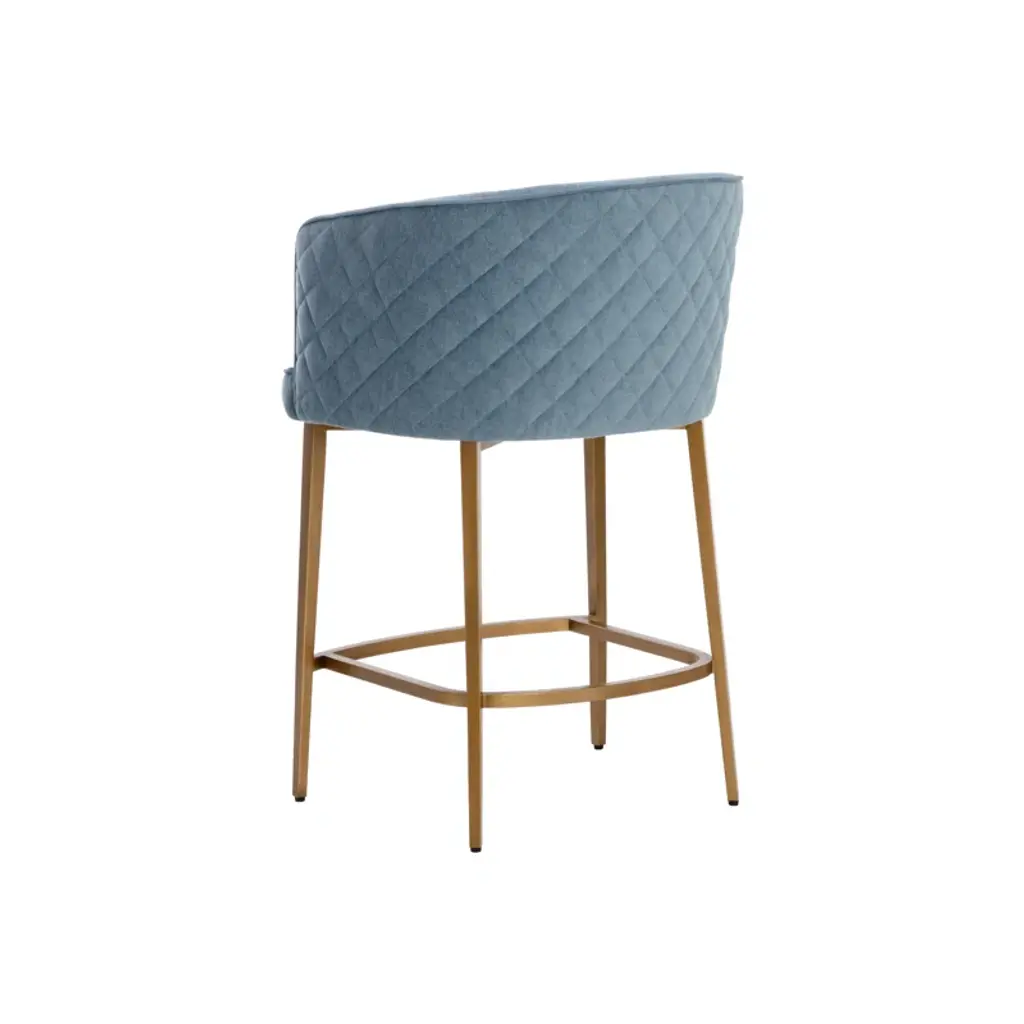 Feminine flair comes to life in this modern counter stool. Stocked in danny iceberg fabric with elegant diamond stitching on the exterior seatback. An antique brass steel frame completes the look.