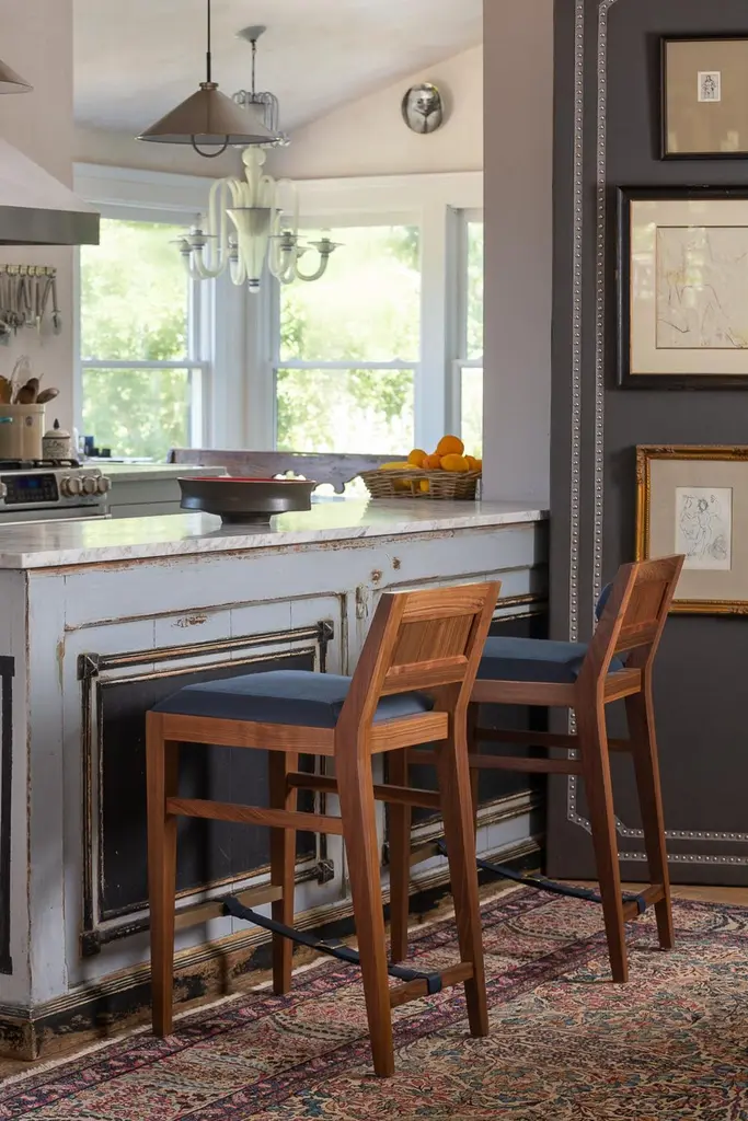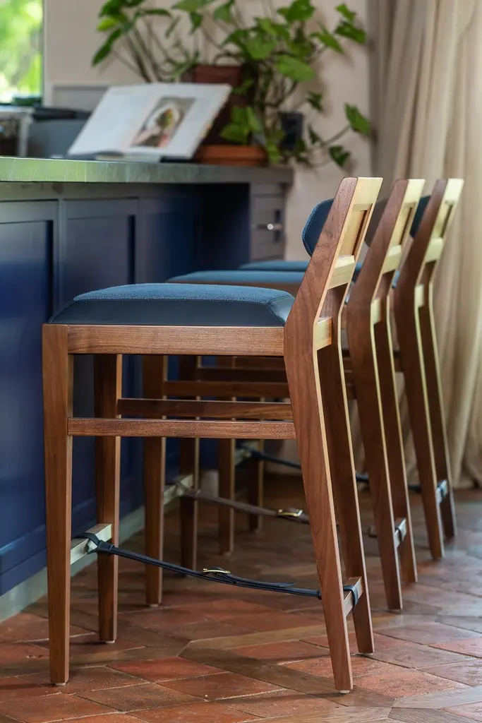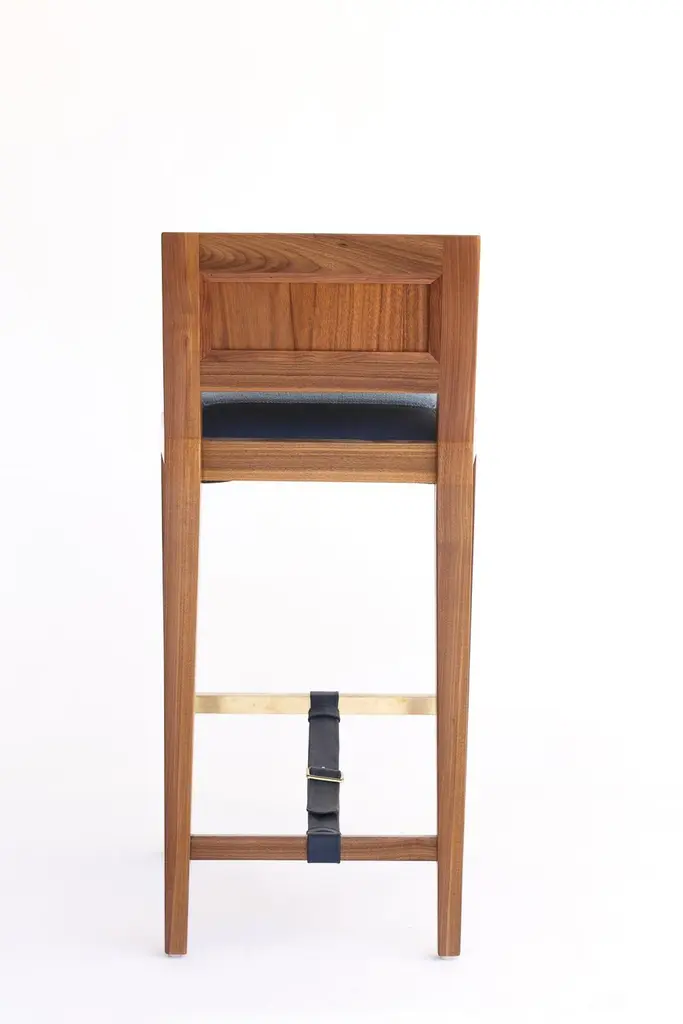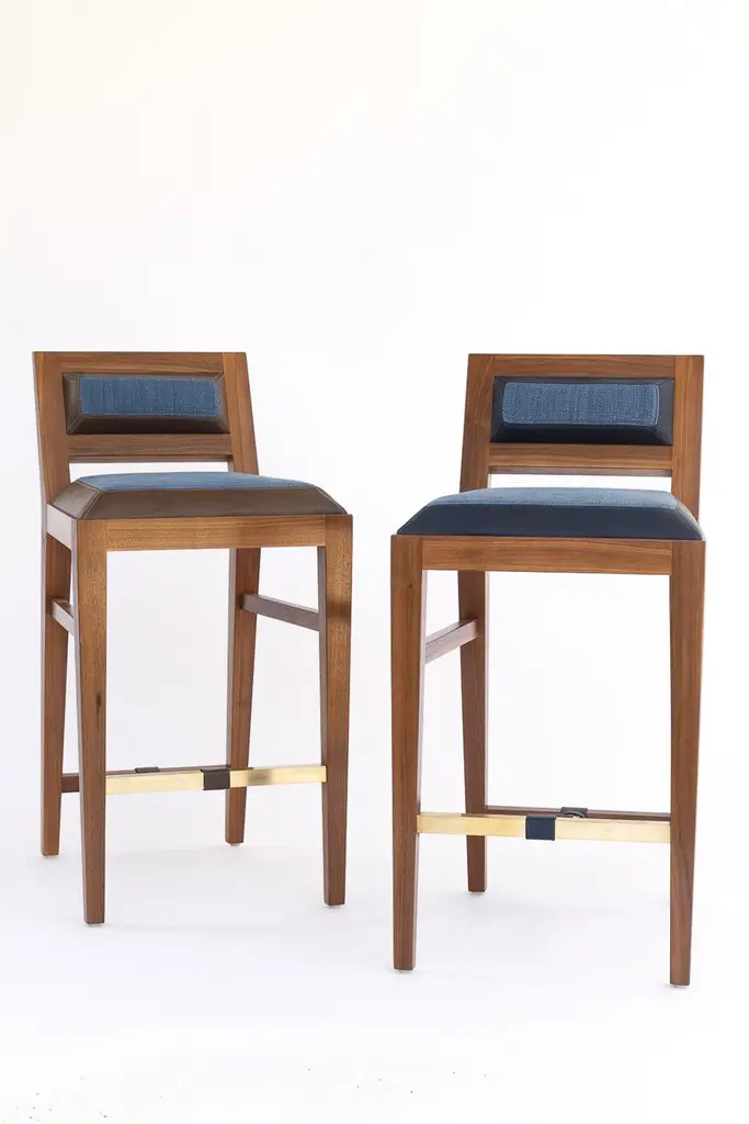 The solid walnut counter stool is handcrafted with traditional joinery. Shown in a combination of leather and fabric upholstery. This is a homage to 1940s French designer Jacques Adnet. Custom sizes and finishes available.