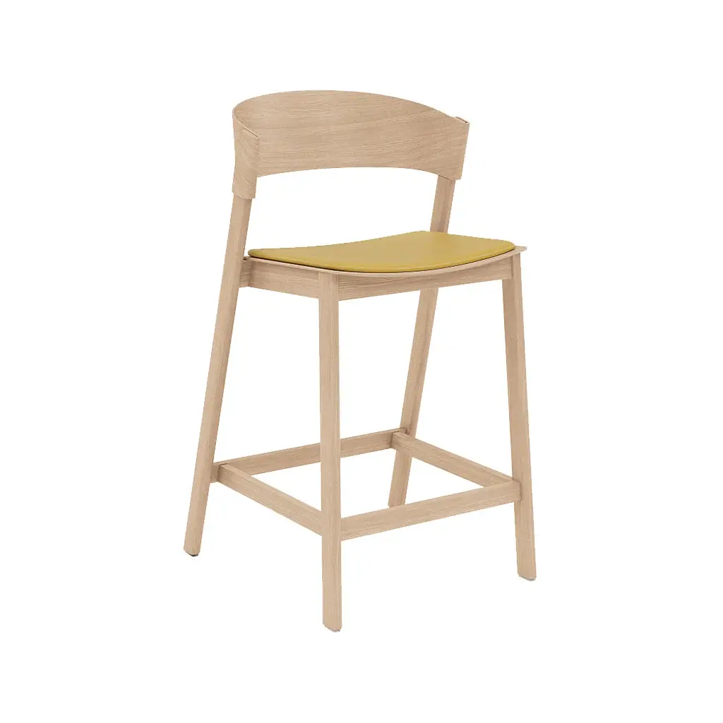 In natural lacquered oak with a buttery cognac-colored leather seat, Muuto offers an fine upholstered version of Thomas Bentzen's wood counter stool. Form-pressed veneer gets a graceful Scandinavian interpretation in the curve of Cover's backrest that folds around the rear legs with elegant simplicity. A similarly cradling rounded seat and integrated footrest assure hours of comfort at mealtime, when entertaining or even at a workplace counter desk.