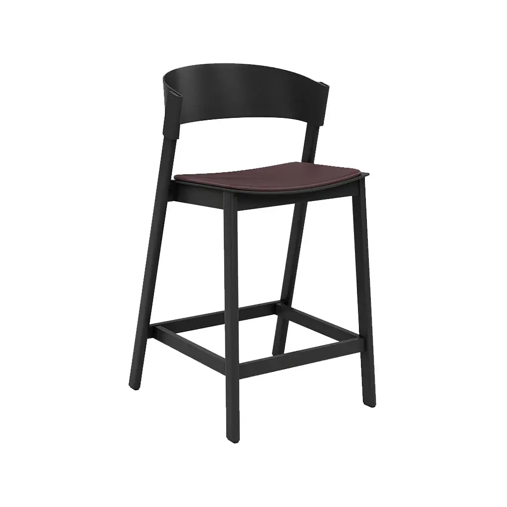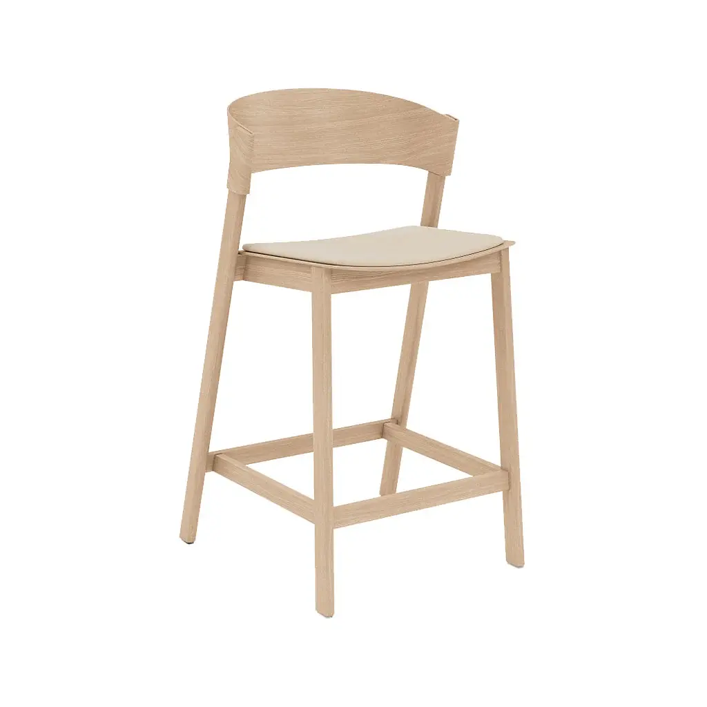 In natural lacquered oak with a buttery cognac-colored leather seat, Muuto offers an fine upholstered version of Thomas Bentzen's wood counter stool. Form-pressed veneer gets a graceful Scandinavian interpretation in the curve of Cover's backrest that folds around the rear legs with elegant simplicity. A similarly cradling rounded seat and integrated footrest assure hours of comfort at mealtime, when entertaining or even at a workplace counter desk.