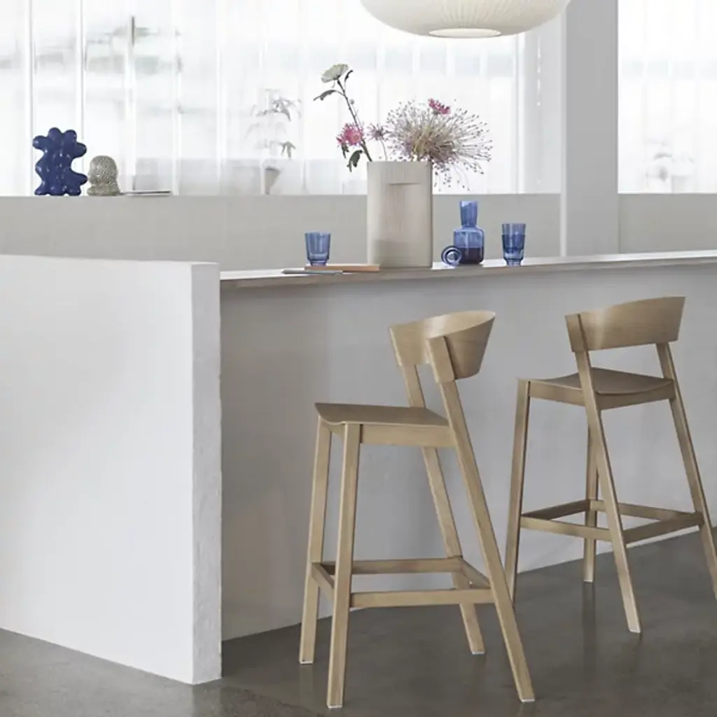 Gather for happy hour with the Cover Stool by Muuto. Designed by Thomas Bentzen, this bar stool is crafted out of fine wood. The neatly sloping seatback gives your back support while seated. Sturdy legs are connected by a linear frame that joins the stool at its base. This decorative piece is made available in both bar stool and counter stool varieties so that you may choose the seat that most fits your needs. This functional work of art upholds Thomas Bentzen’s belief in designing products that exemplify Scandinavian design while fulfilling human needs.