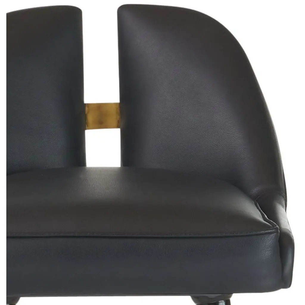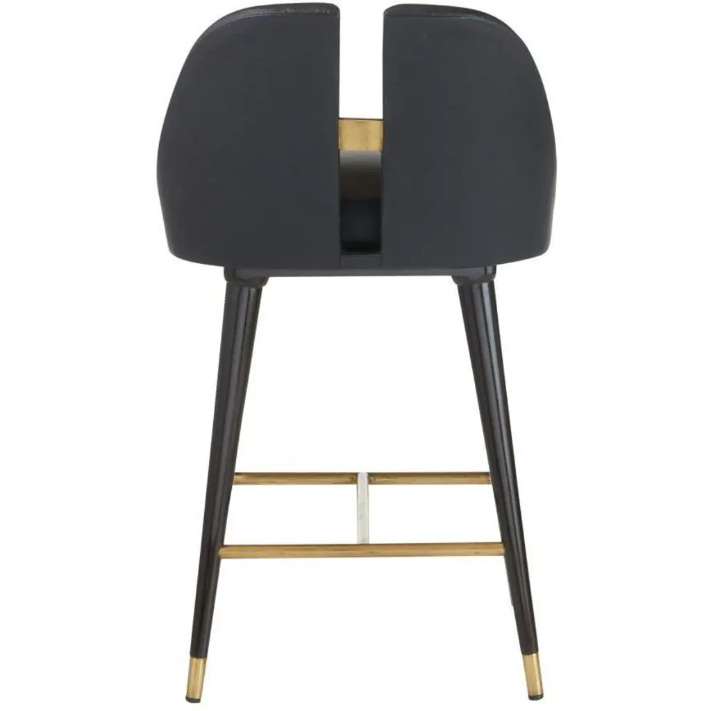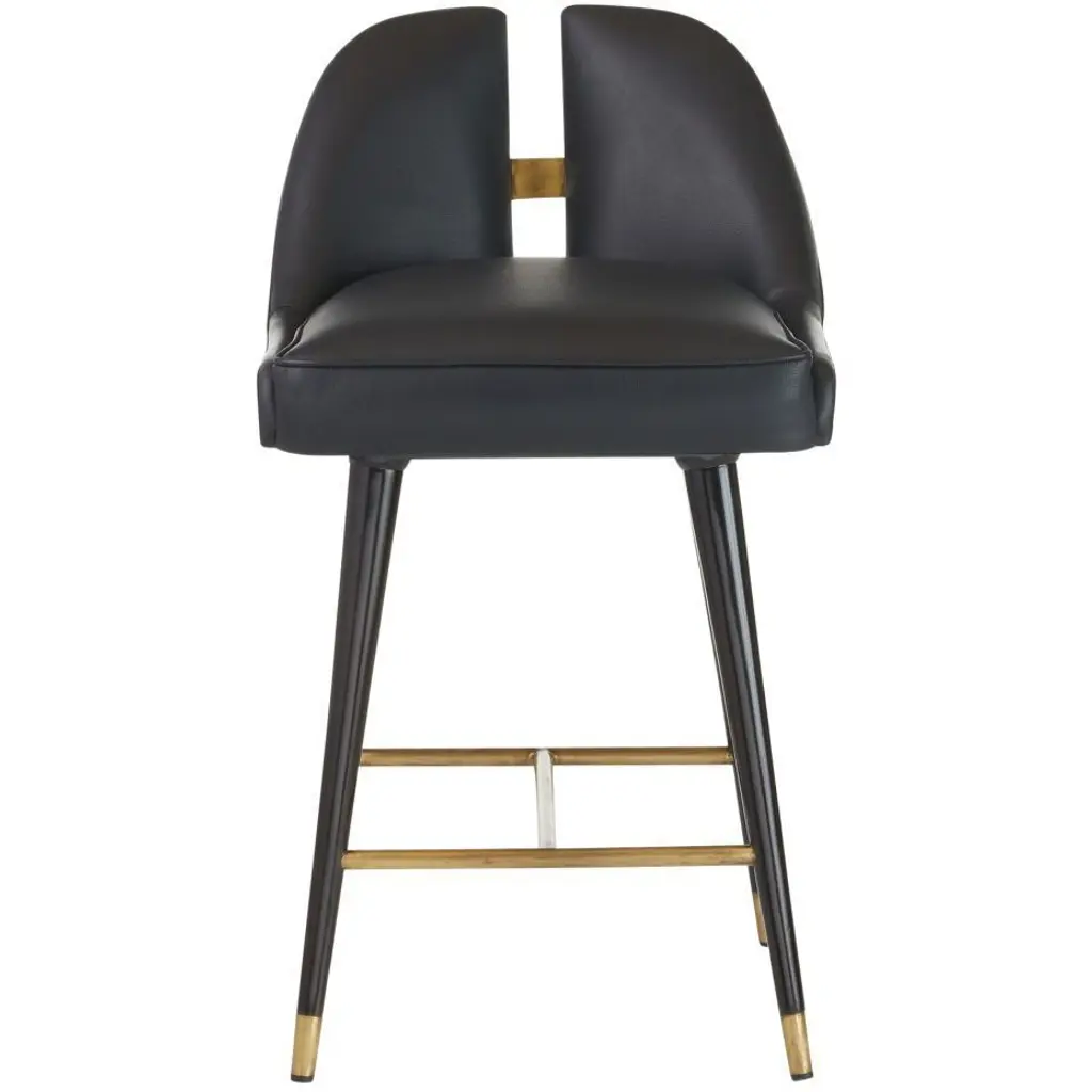 The ideal balance of masculine and feminine, a sleek slit detail mimics an alluring open-backed dress. Upholstered in soft black leather, this counter stool is enhanced with polished antique brass joinery. Poised on slim, ebony beech wood legs tipped in brass. Leather will vary.