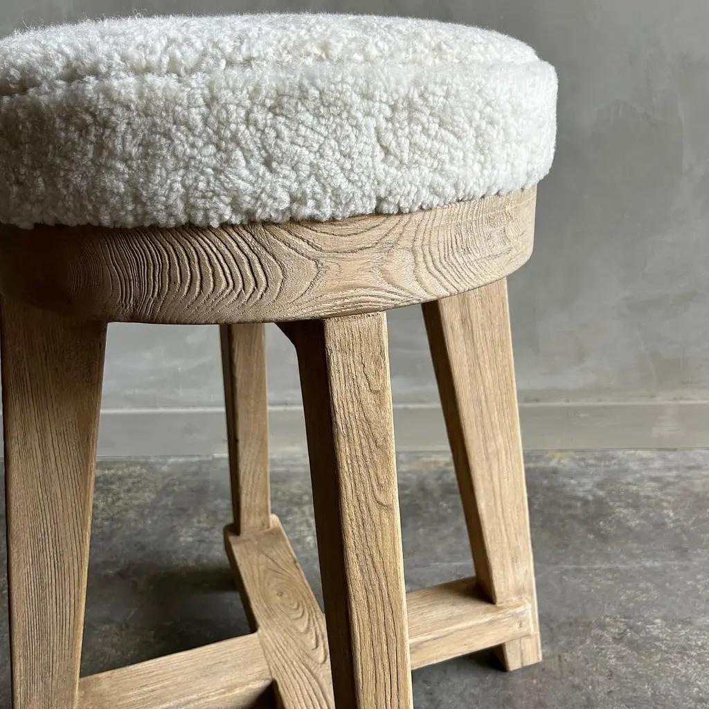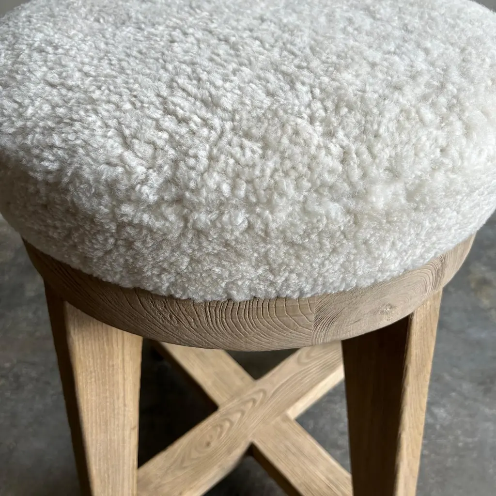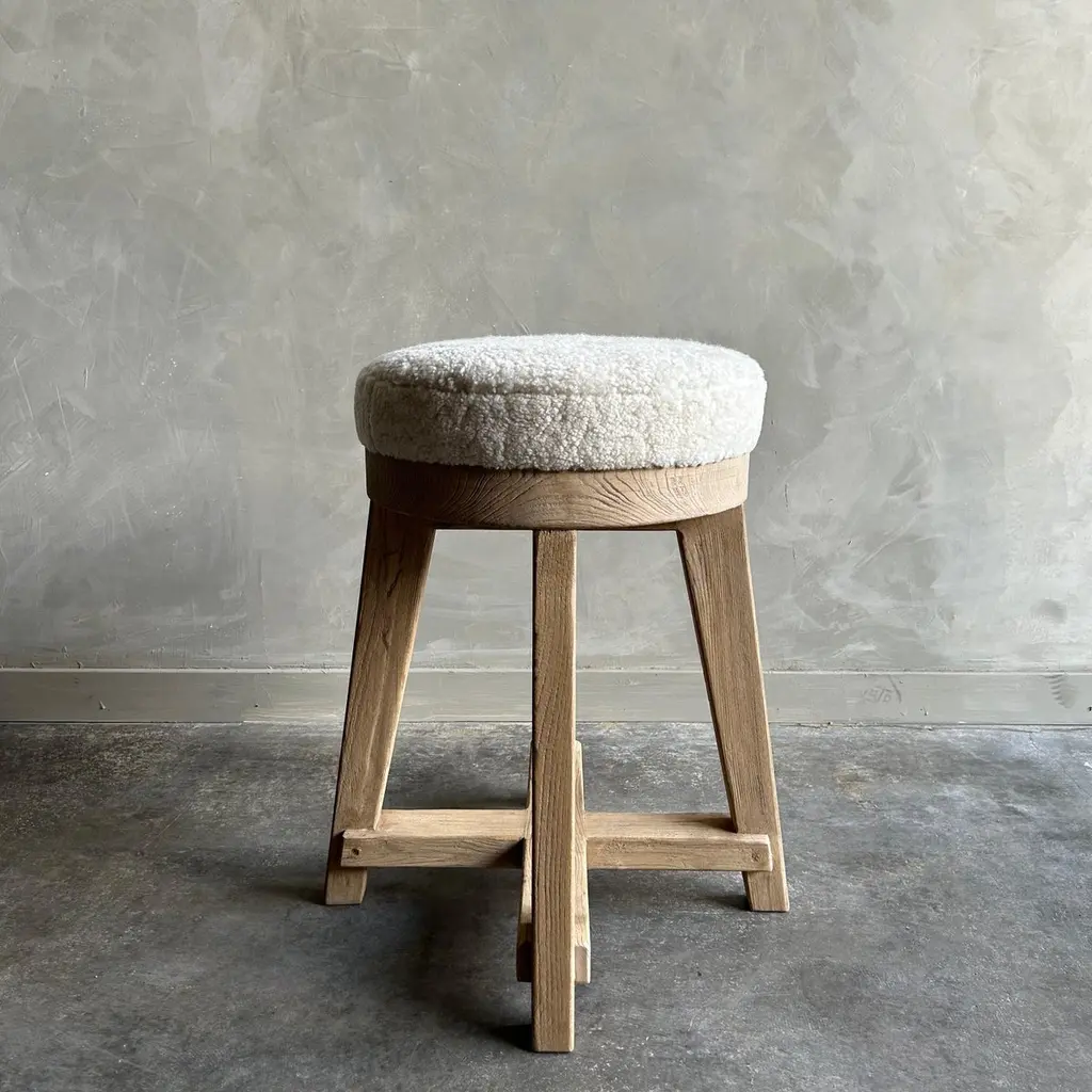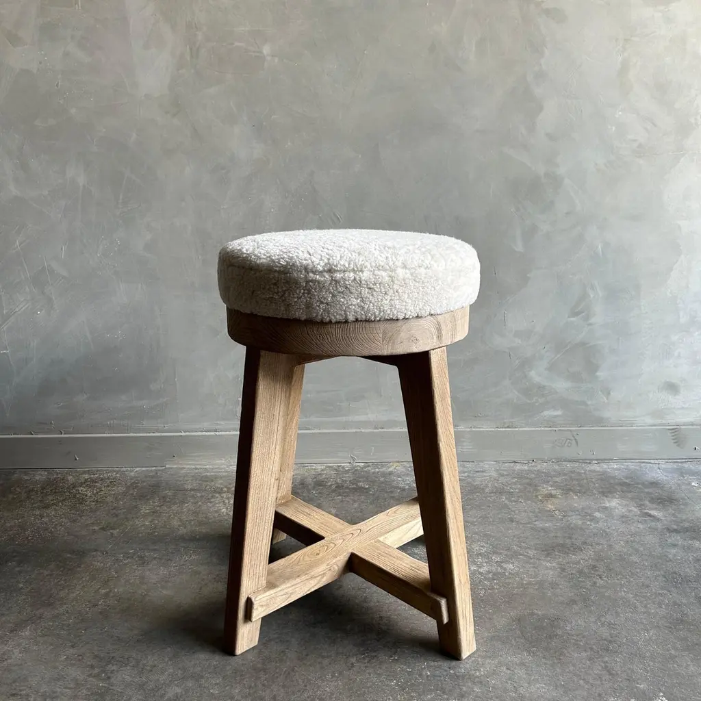 Jasper Counter StoolMade from reclaimed elm wood timbers, this counter stool has a unique vintage feel.Upholstered in 100% lambs sheep, we also offer C.O.M. & our Libeco Linen colors in oyster white, oatmeal and vintage flax. Finish: Natural3" foam seat topDimensions 21”w x 21”d x 25”hSeat Diameter 16"