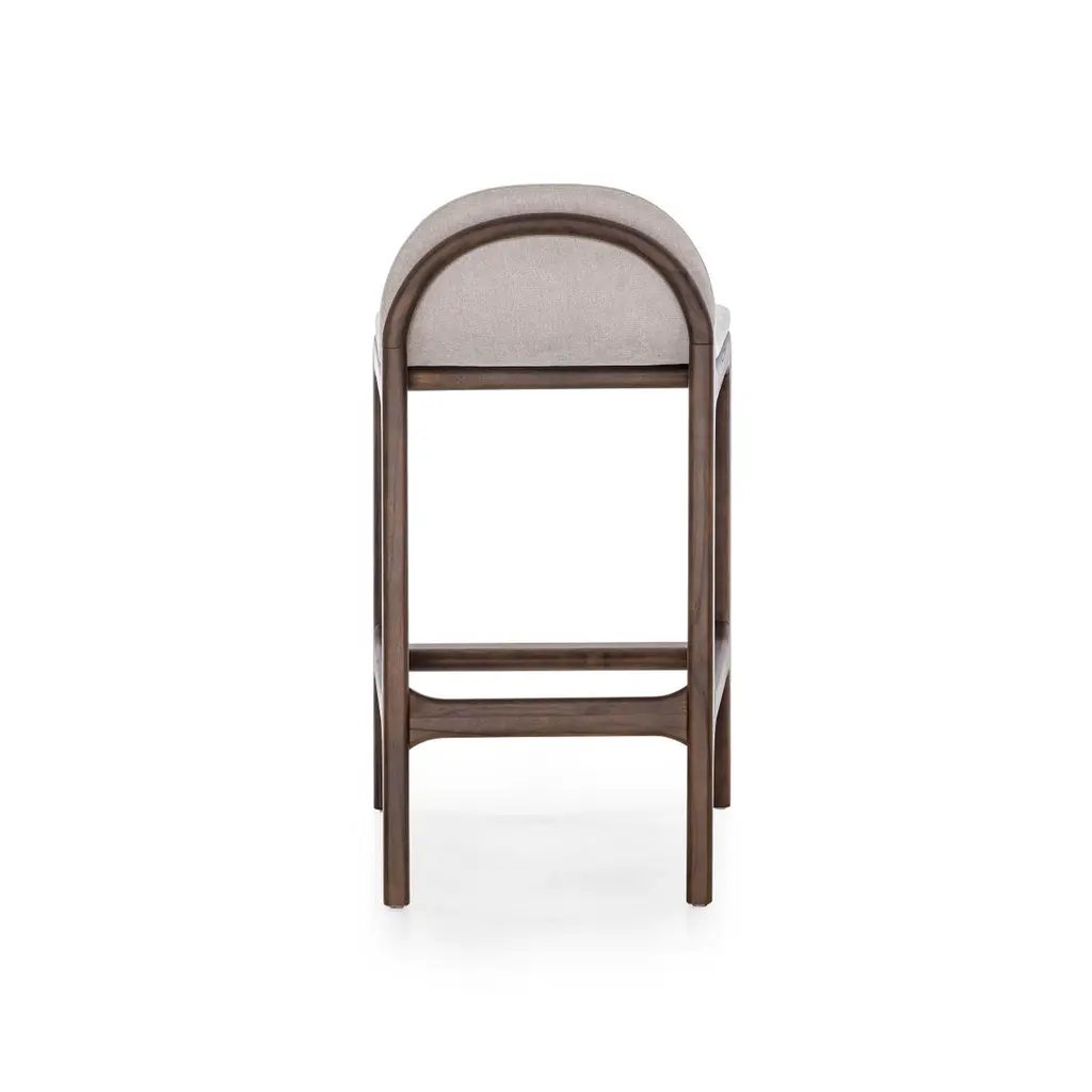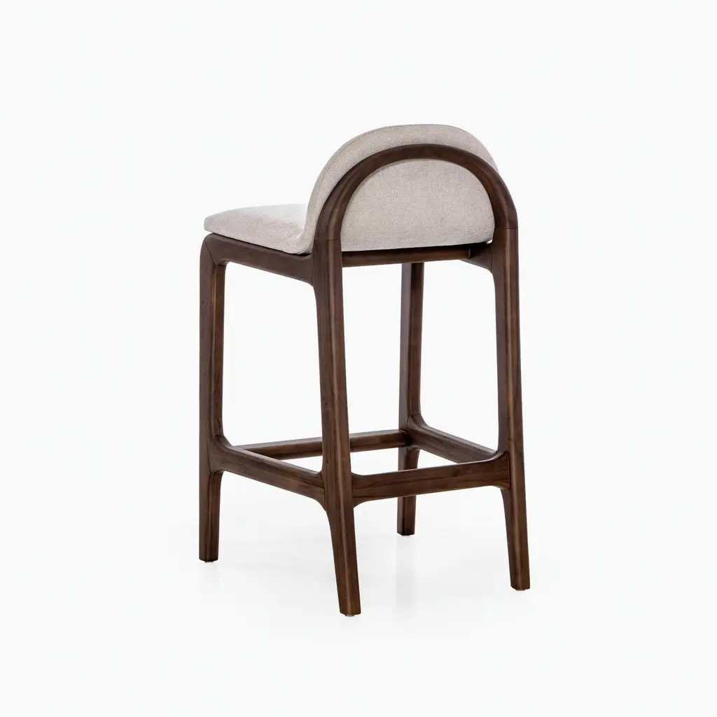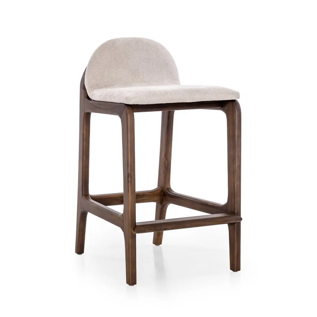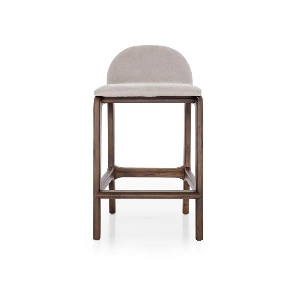 A Ura counter height stool designed by Uultis Studio with walnut finish and beige fabric upholstery. Please check availability prior to purchase.The Ura counter stool showcases a harmonious blend of contemporary design and functional sophistication, making it a standout addition to any space. Handcrafted in Brazil by Uultis Studio, this stool features an elegant walnut finish complemented by an upholstered seat in Wheat Thin Twill Weave. fabric. Its solid wood frame is sustainably sourced, underscoring a commitment to eco-conscious craftsmanship.Ideal for both residential and commercial use, the Ura stool offers exceptional versatility. Its minimalist profile seamlessly integrates into modern kitchen islands, home bars, or stylish lounge areas, while its sturdy frame ensures durability for bustling commercial environments. The elastic webbing and high-density foam of the cushioned seat deliver unparalleled comfort, perfect for hosting long dinners or lively gatherings.The refined silhouette, enhanced by subtle European-inspired detailing, lends a sophisticated charm that elevates contemporary interiors. Whether used individually or as a set, the Ura counter stool brings understated elegance to any setting. Fully customizable and delivered pre-assembled, this stool merges style and practicality, embodying Uultis Studio's dedication to timeless, environmentally responsible design.