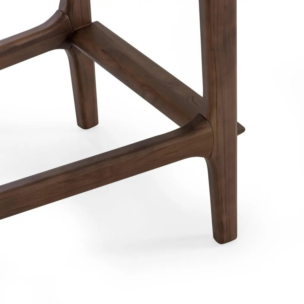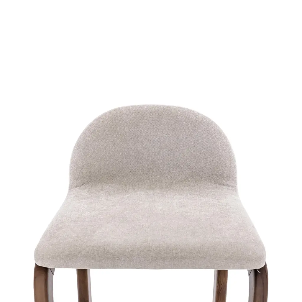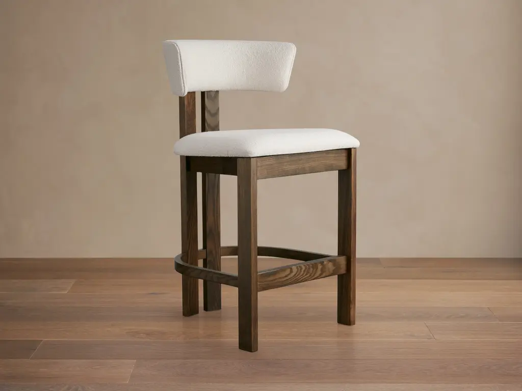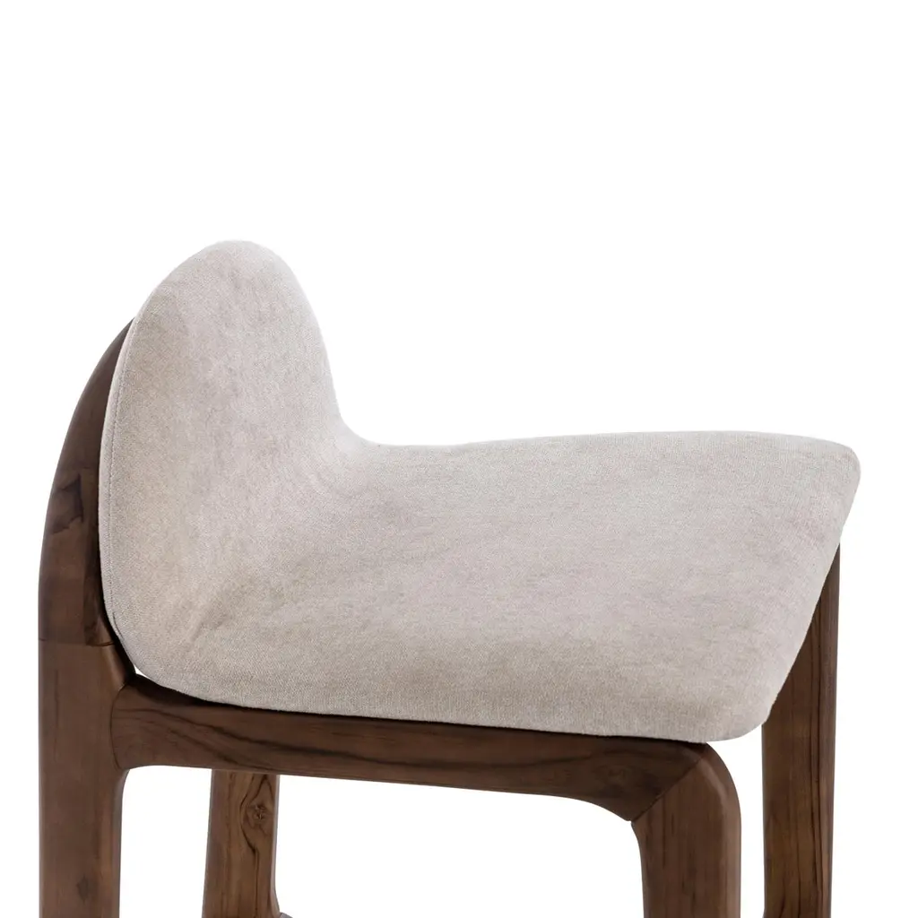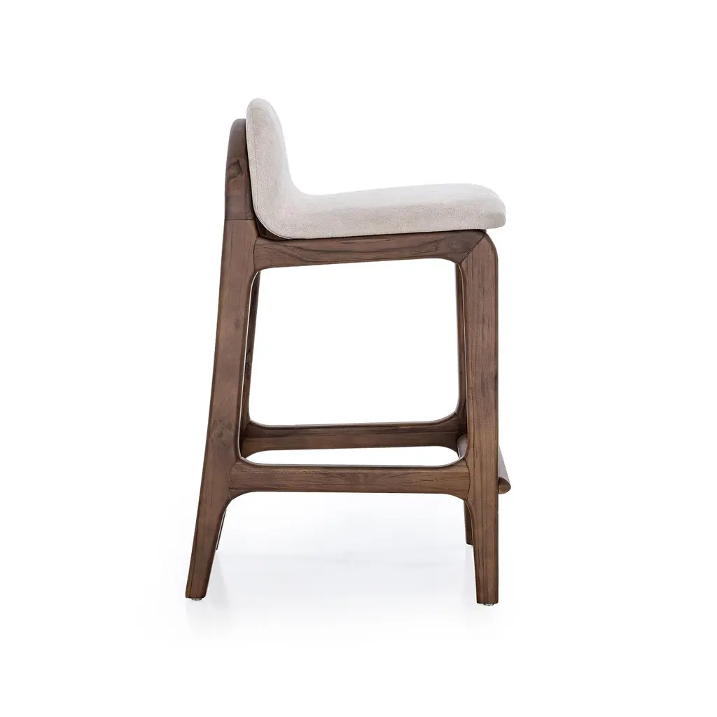 A Ura counter height stool designed by Uultis Studio with walnut finish and beige fabric upholstery. Please check availability prior to purchase.The Ura counter stool showcases a harmonious blend of contemporary design and functional sophistication, making it a standout addition to any space. Handcrafted in Brazil by Uultis Studio, this stool features an elegant walnut finish complemented by an upholstered seat in Wheat Thin Twill Weave. fabric. Its solid wood frame is sustainably sourced, underscoring a commitment to eco-conscious craftsmanship.Ideal for both residential and commercial use, the Ura stool offers exceptional versatility. Its minimalist profile seamlessly integrates into modern kitchen islands, home bars, or stylish lounge areas, while its sturdy frame ensures durability for bustling commercial environments. The elastic webbing and high-density foam of the cushioned seat deliver unparalleled comfort, perfect for hosting long dinners or lively gatherings.The refined silhouette, enhanced by subtle European-inspired detailing, lends a sophisticated charm that elevates contemporary interiors. Whether used individually or as a set, the Ura counter stool brings understated elegance to any setting. Fully customizable and delivered pre-assembled, this stool merges style and practicality, embodying Uultis Studio's dedication to timeless, environmentally responsible design.