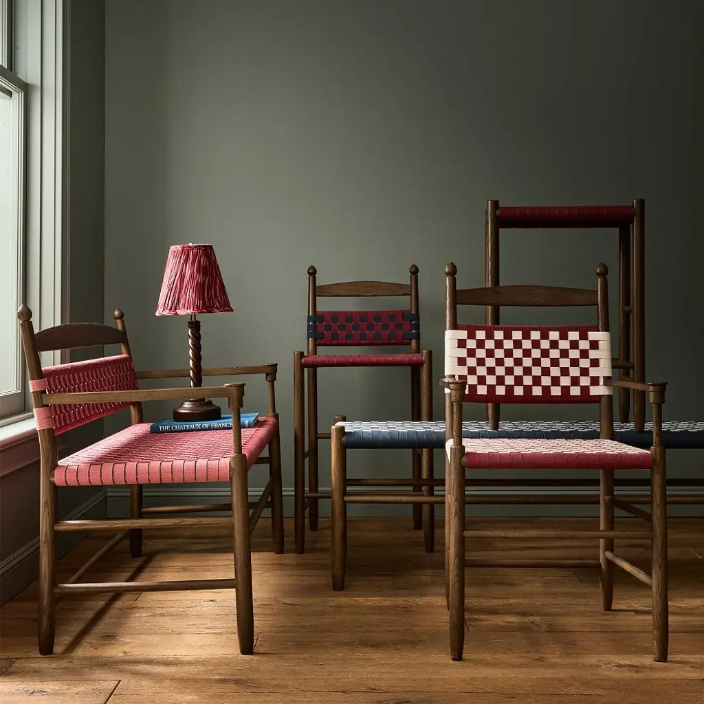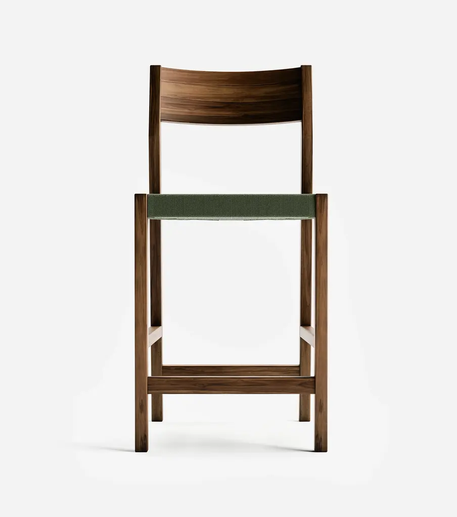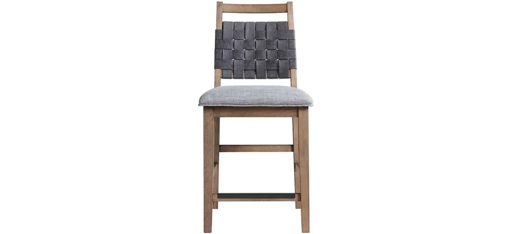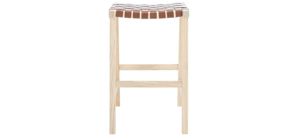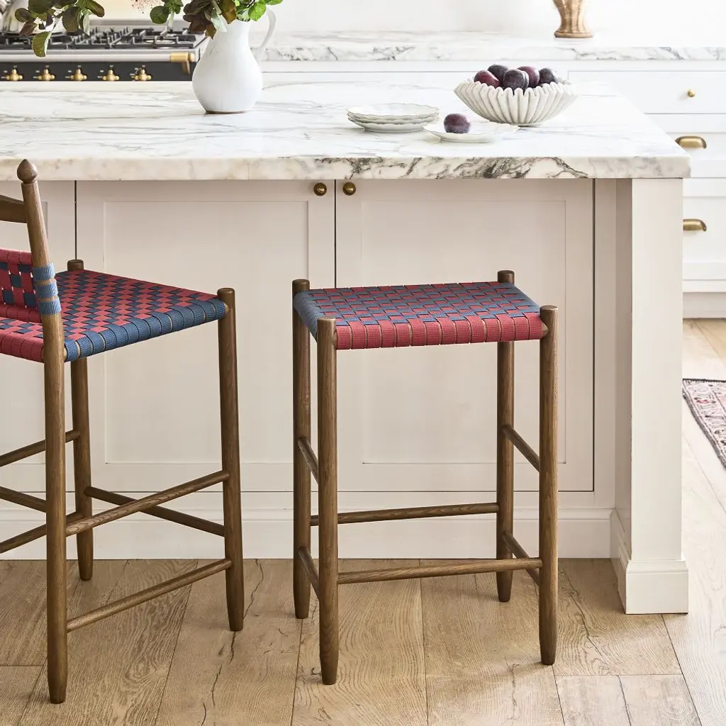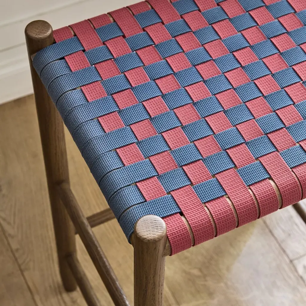 A new twist on tradition. Woven with 100% cotton webbing in a burgundy and dark blue pattern, this Shaker-inspired counter stool features an FSC®-certified solid wood frame.
