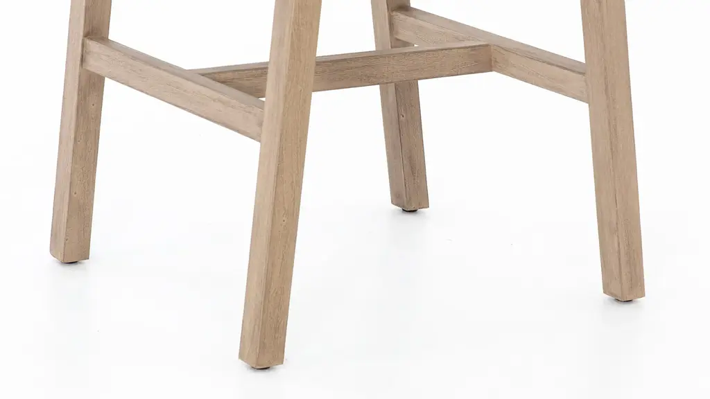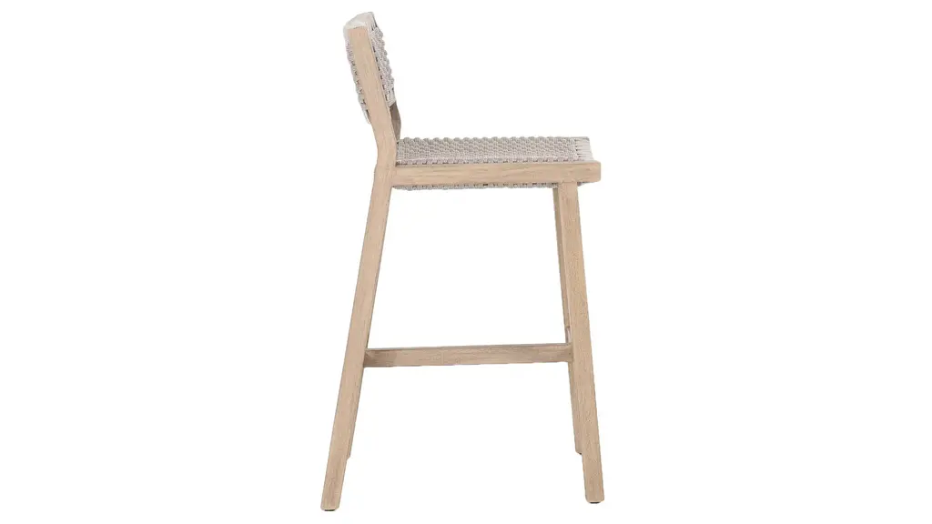 A textural take on outdoor styling, washed brown teak welcomes thick, handwoven rope seating in an inviting light brown with the Delano outdoor counter stool. Cover or store indoors during inclement weather and when not in use.