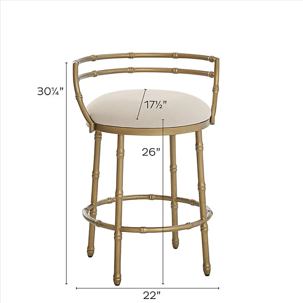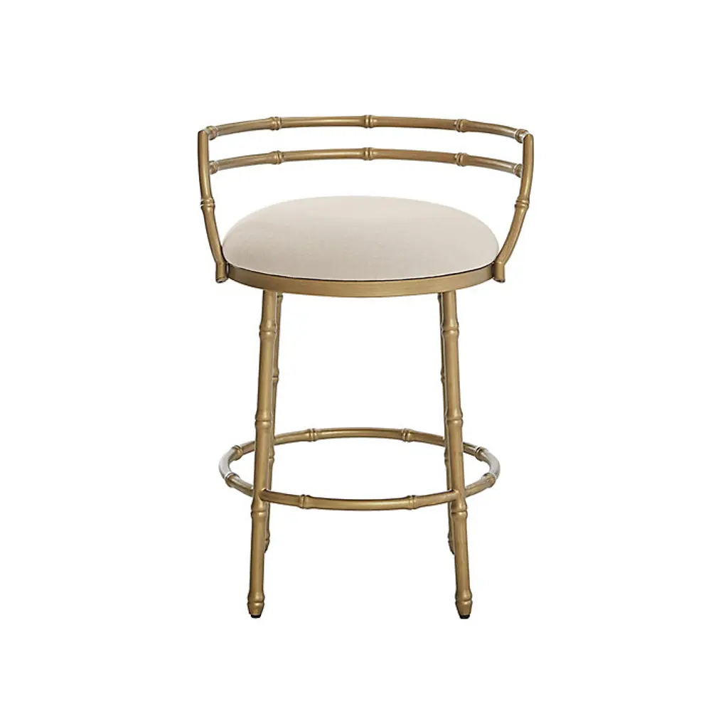 A dressy nod to classic Chinese Chippendale style, our Della Counter Stool raises the designer bar for kitchen seating. The airy iron frame is handmade with stylish bamboo details and warm brass finish. A low back keeps the look light and open, while the deeply padded round seat makes that second cup of coffee an even better idea. The comfy seat is expertly upholstered in our cleanable, family-friendly Sandberg Parchment InsideOut Performance Fabric, a beautiful choice for busy spill-prone spaces like the kitchen island. Seat removes for easy reupholstering in your favorite fabric, including our huge selection of easy-care performance fabrics. Della Stool features: Ballard Designs Performance Fabrics by InsideOut features: