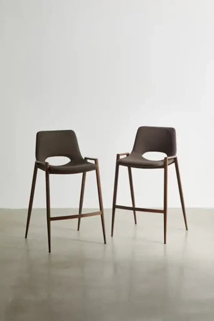 A sleek addition to your kitchen island, these Demi Counter Stools feature clean lines with armrest support and a plush faux leather seat paired with faux wood-patterned steel legs. **Features** \- Demi Counter Stool Set \- Plush, faux leather upholstered seat \- Armrest support \- Faux wood steel legs \- Built-in footrest for comfortable \- Rubber feet to protect your floor from scratches \- Assembly required **Content + Care** \- Includes 2 dining chairs \- Assembly required - instructions and hardware are included \- 100% Polyurethane cover; plywood, steel \- Wipe clean \- Imported **Size** \- Dimensions: 20.3"l x 20.7"w x 35.6"h \- Leg height: 27.2" \- Weight: 12.8 lbs \- Shipping package dimensions: 30"l x 23"w x 21"h \- Shipping package weight: 29 lbs