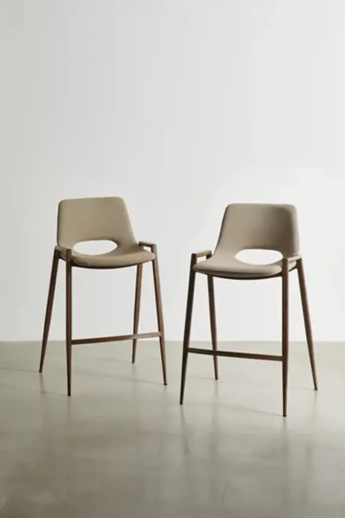 A sleek addition to your kitchen island, these Demi Counter Stools feature clean lines with armrest support and a plush faux leather seat paired with faux wood-patterned steel legs. **Features** \- Demi Counter Stool Set \- Plush, faux leather upholstered seat \- Armrest support \- Faux wood steel legs \- Built-in footrest for comfortable \- Rubber feet to protect your floor from scratches \- Assembly required **Content + Care** \- Includes 2 dining chairs \- Assembly required - instructions and hardware are included \- 100% Polyurethane cover; plywood, steel \- Wipe clean \- Imported **Size** \- Dimensions: 20.3"l x 20.7"w x 35.6"h \- Leg height: 27.2" \- Weight: 12.8 lbs \- Shipping package dimensions: 30"l x 23"w x 21"h \- Shipping package weight: 29 lbs