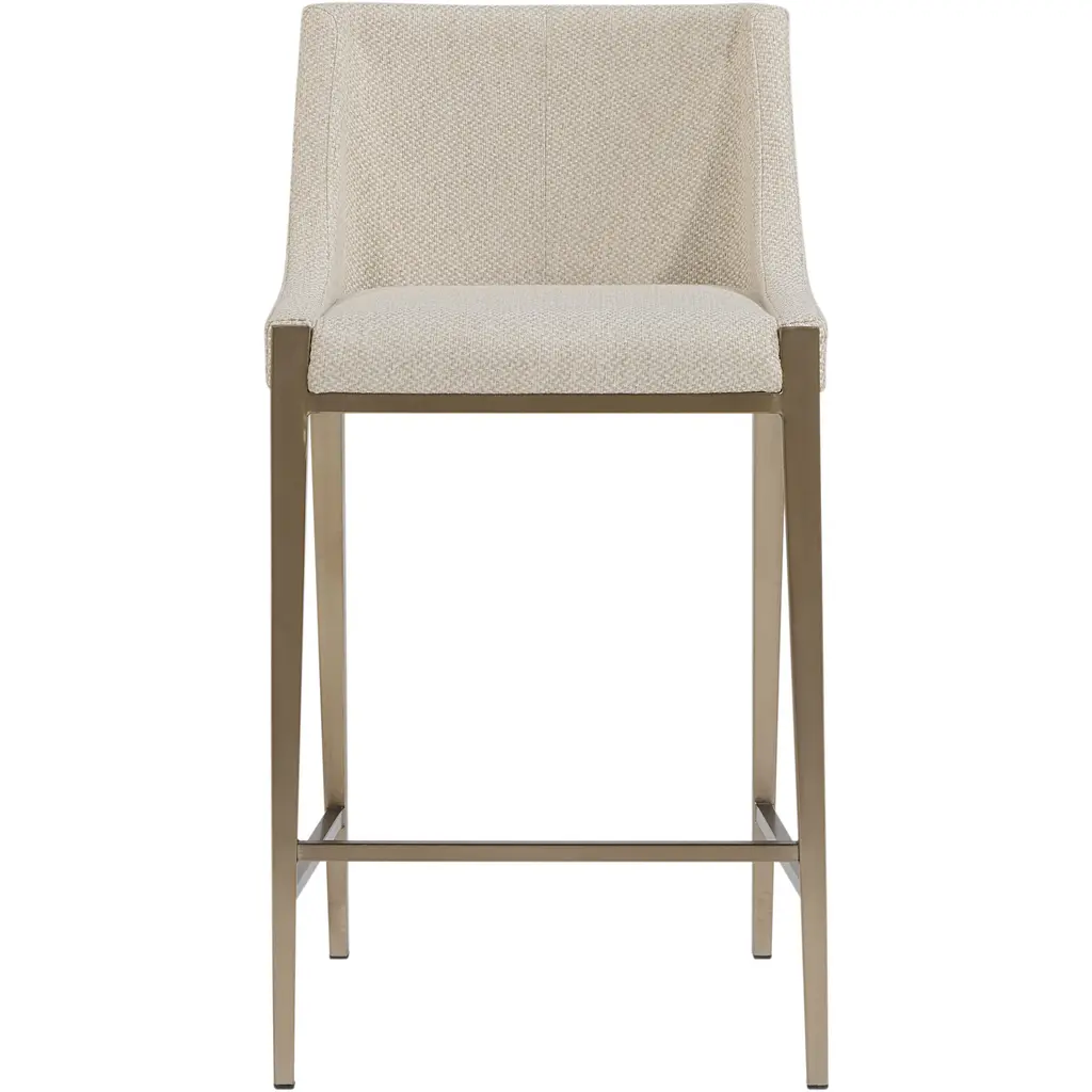 With its clean and modern design, this counter stool is a stunning addition to any dining or kitchen space. Stocked in our textured monument oatmeal fabric and completed with powder-coated stainless steel legs in an antique brass finish.