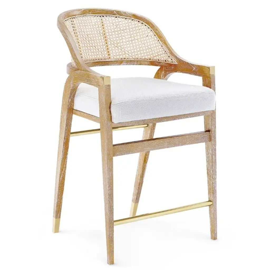 Mixed materials shine in the Edward counter stool. Natural wood grain peeks through an understated natural finish on the Cape Lilac Mahogany frame. The curved lacquered hand-tied cane seat back provides delicate detailing, while hand-cast brass stretchers, sabots, and armcaps add luxe finishing touches. A natural linen drop-in cushion makes for a supremely comfortable seat.