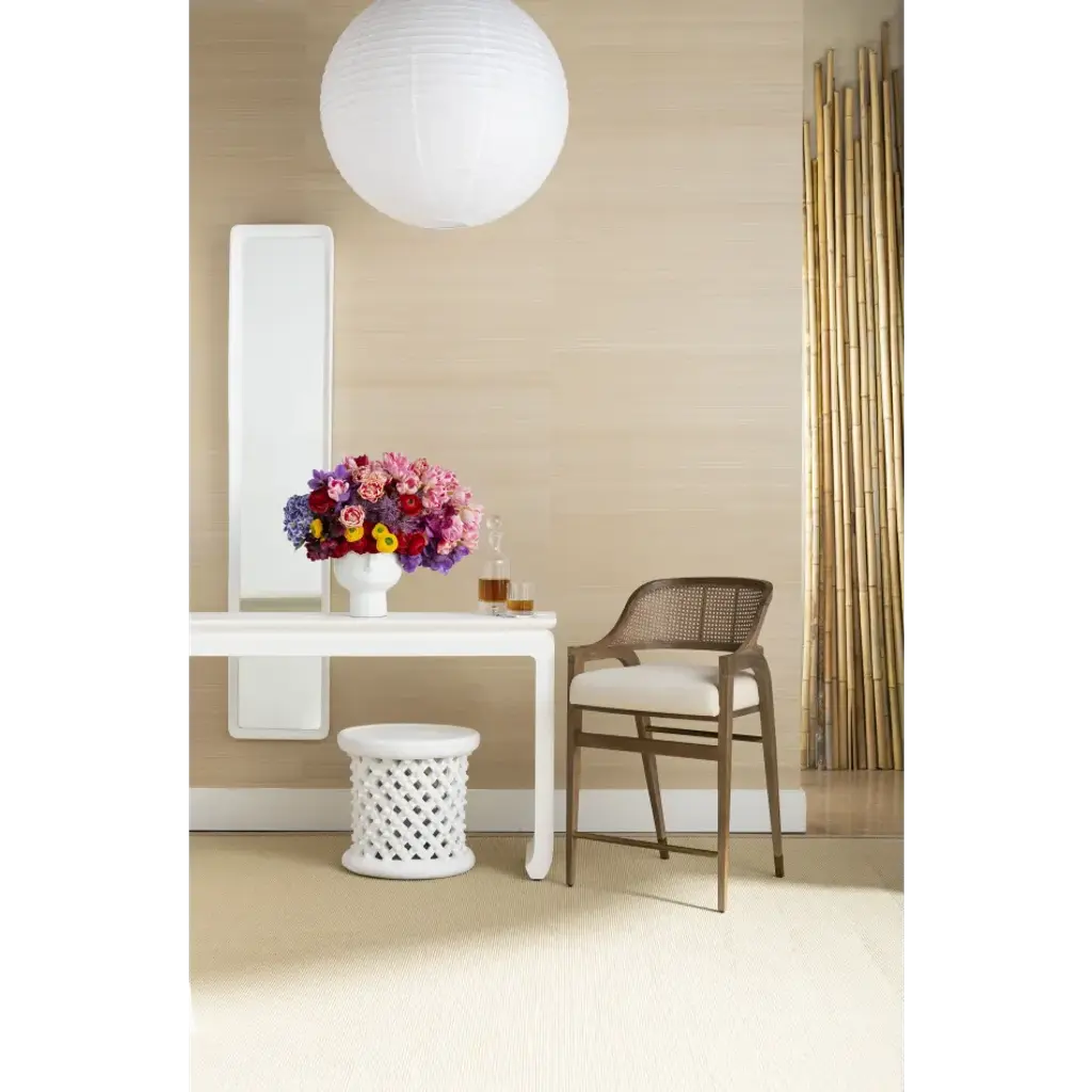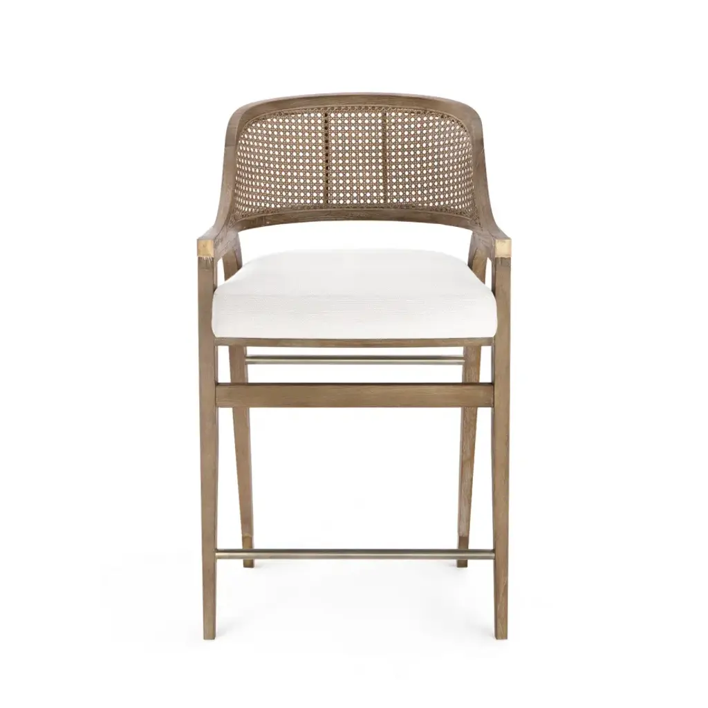 With the Edward Collection, our craftsmen have taken a classic shape and energized it using fresh mixed materials. The result is a complementary selection of seats which all make a sophisticated impression with an air of casual cool. Here, the Edward Counter Stool cuts a fine figure in Cape Lilac Mahogany, with a driftwood finish that boldly underscores the natural grain of the elongated wooden frame. Its back boasts a screen of lacquered hand-tied caning, with a form-fitting curve to ensure ultimate comfort. Metallic accents speak to our artisans’ eye for detail, with hand-cast brass stretchers, sabots, and armcaps providing a luxurious finish touch. The Edward is an ideal choice for a kitchen island dining set, and would fit well in anything from an urban loft kitchen to a modern farmhouse scheme.