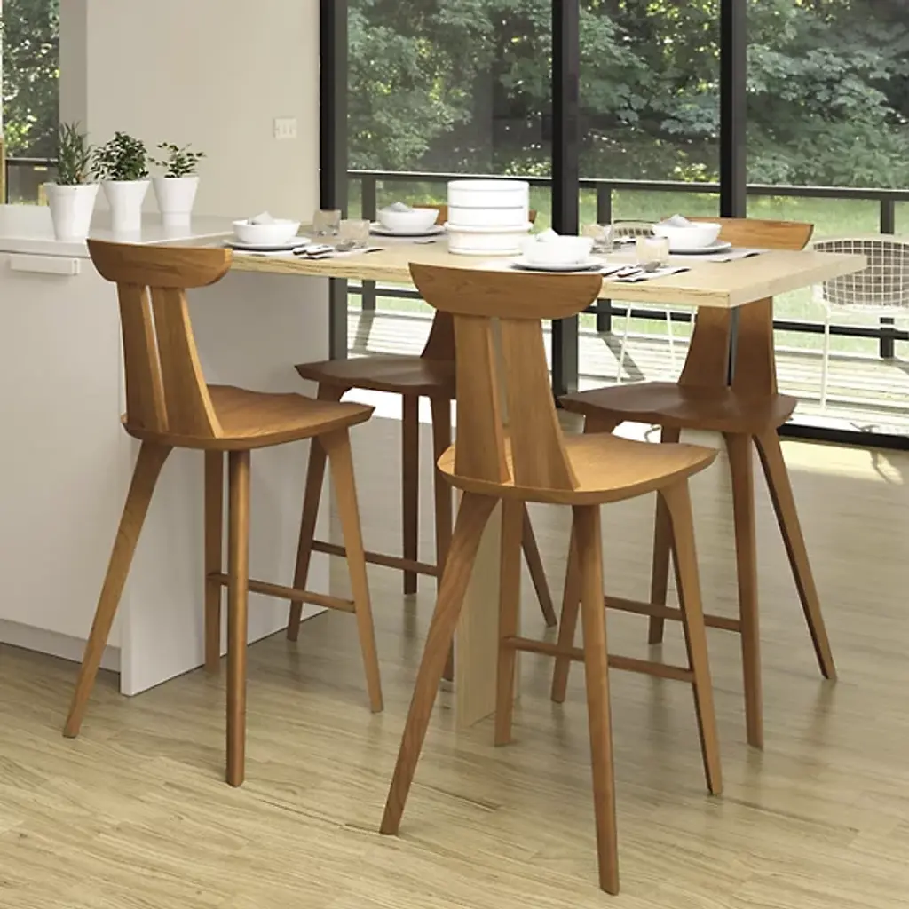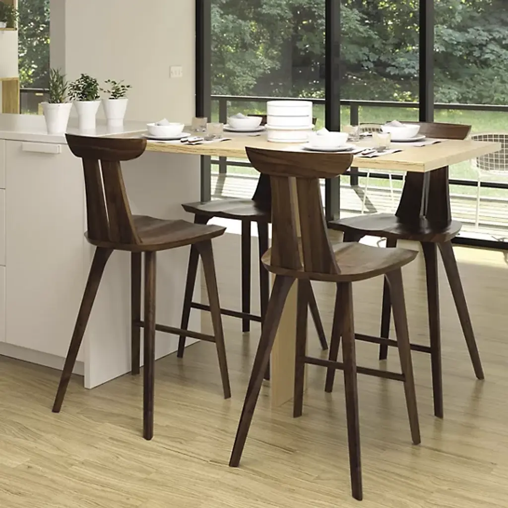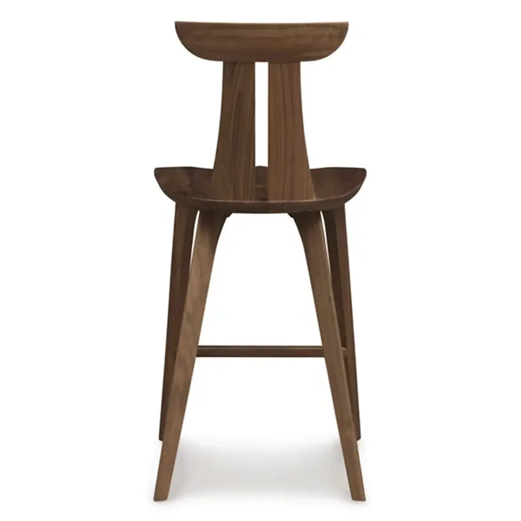 The exotic curves of the Estelle Chair, elongated. The willowy tapered legs of the Copeland Furniture Estelle Counter Stool are nearly 8 inches longer than those of the original, with an added footrest for stability and comfort when sitting up high. It comes in a range of wood finishes, making it a truly elegant addition to any modern kitchen or dining room.