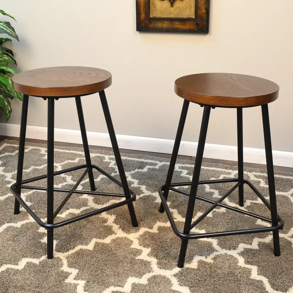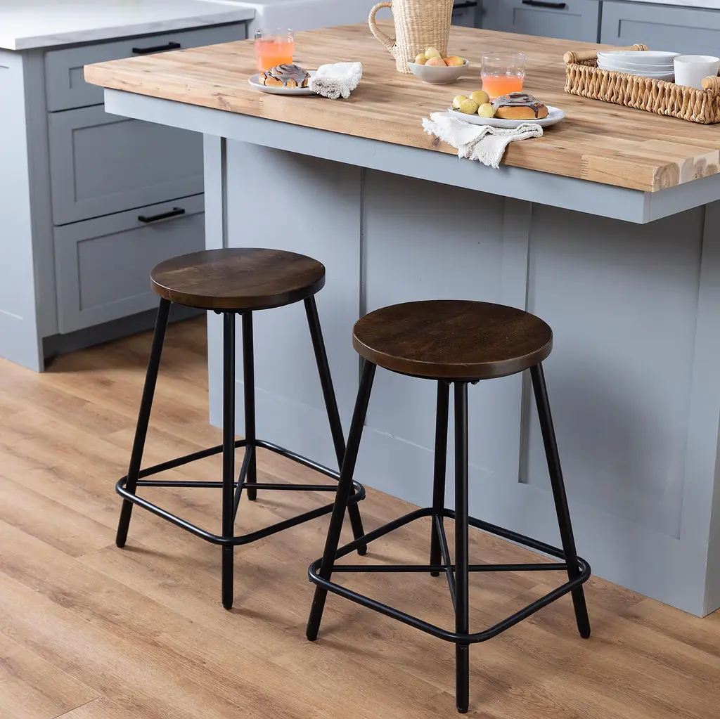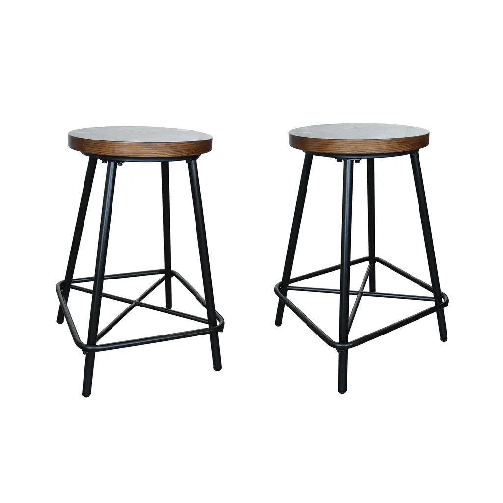 Sophisticated, versatile and stylish, our set of 2 Farmhouse Counter Stools are an attractive and functional addition to any home. The richly hued elm finished seat features an ash veneer and is set atop a black metal base with an x-brace and footrest. The clean lines and geometric details make these stools a timeless seating solution for any space. Perfect for breakfast nooks, additional seating, kids' seats, they are 24"H and are a great option for any standard table. Durable, black powder-coated metal base stands up to your family's busy lifestyle.