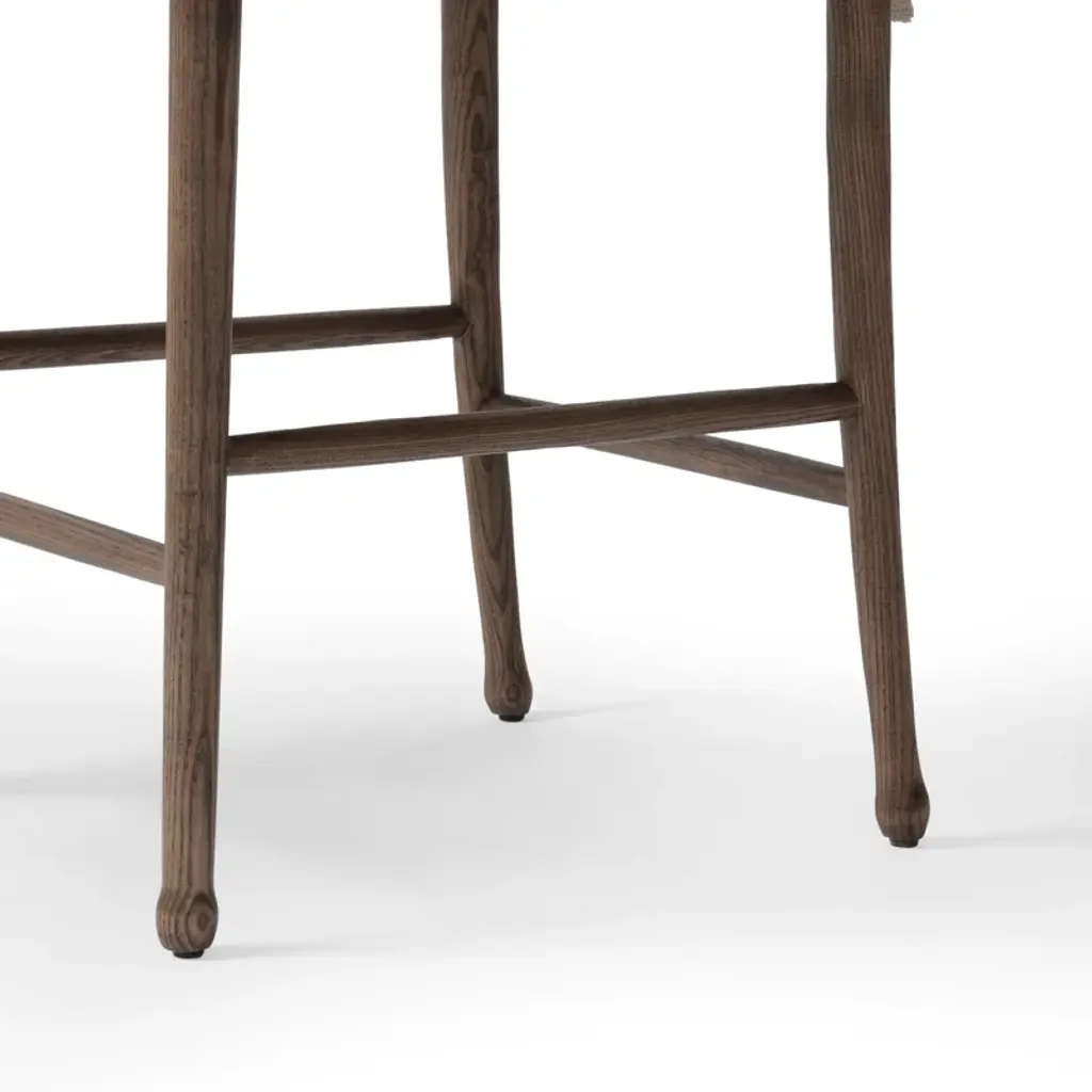 Traditional, updated. The classic turn shape-inspired design is simplified for a clean look in this antique walnut counter stool, balanced with slightly curved legs for a softened look. Complemented by a soft paper cord back and seat cushion for a welcoming, relaxed sit.