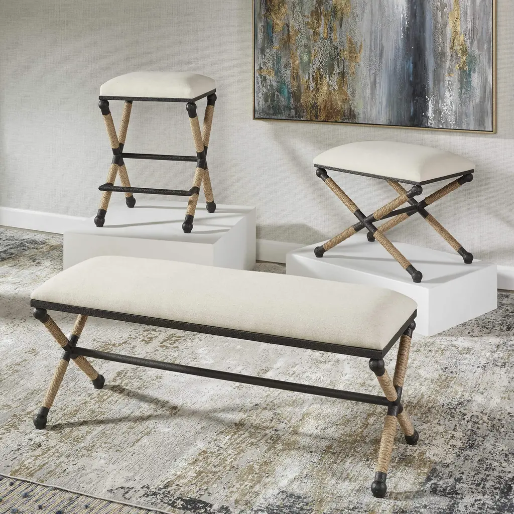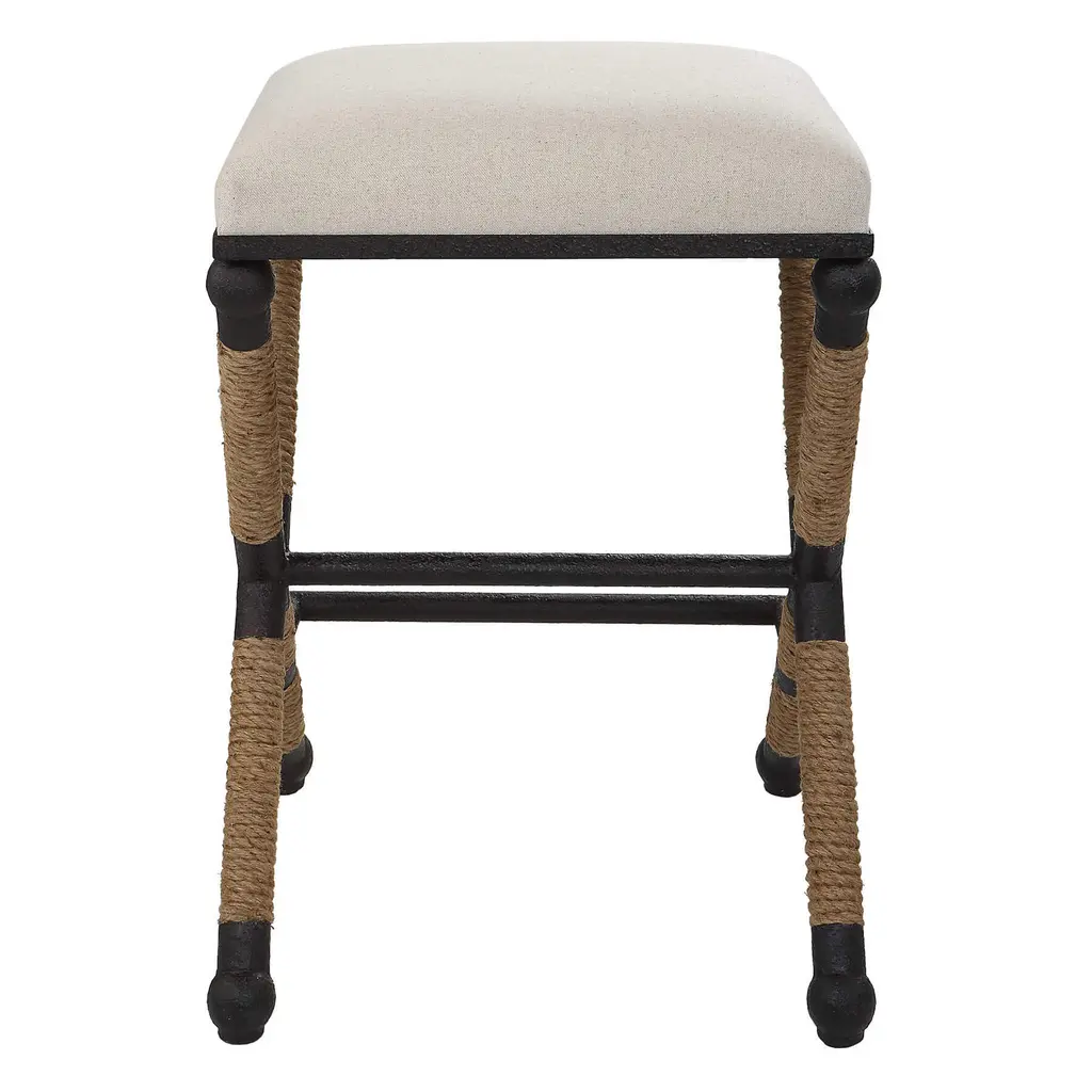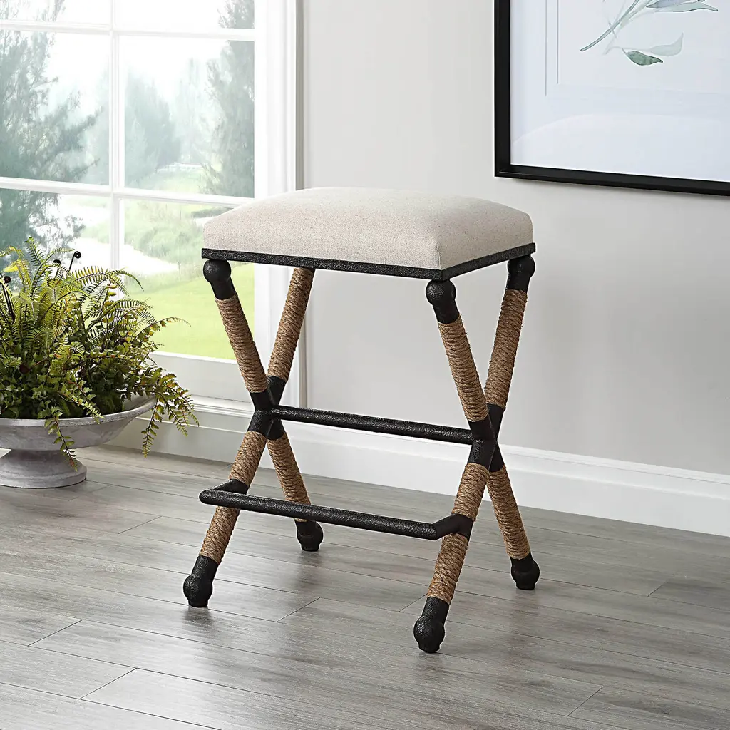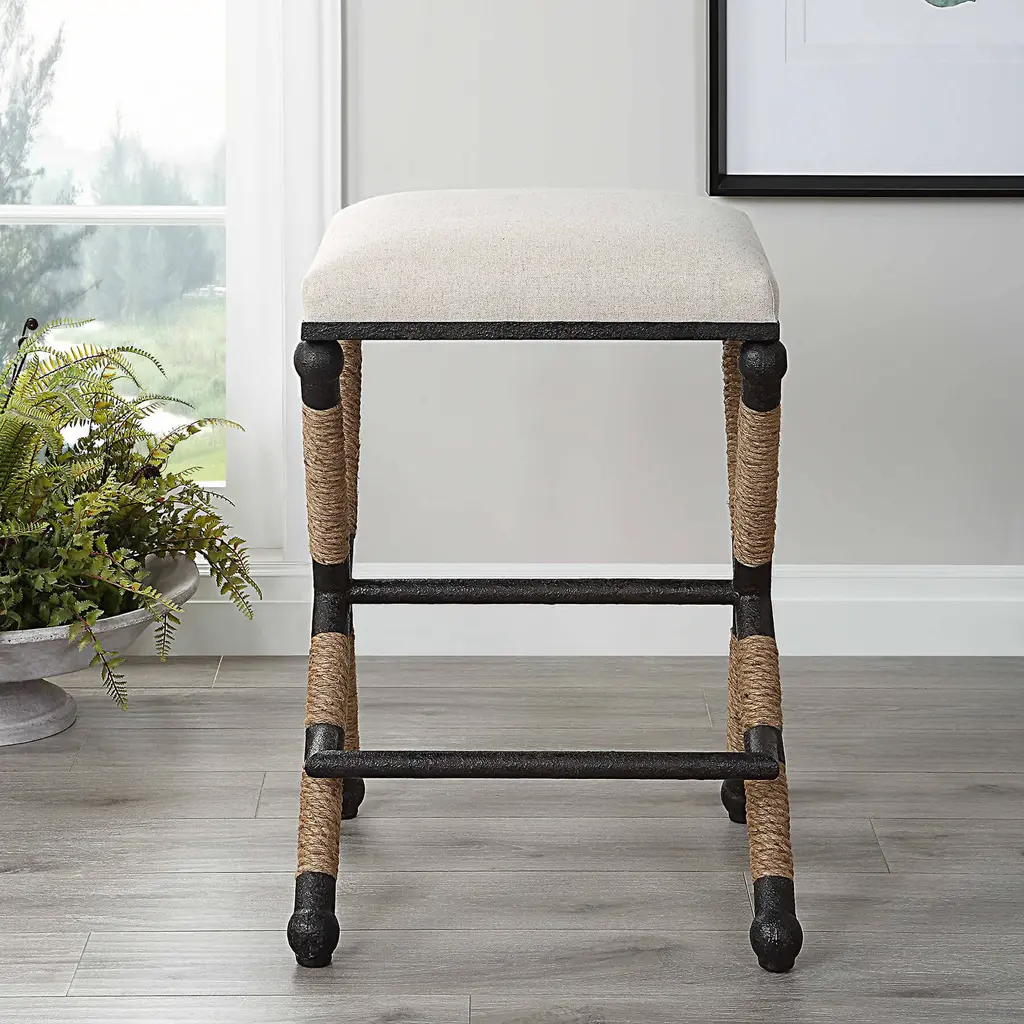 Carefree island style meets modern sophistication in the Firth counter stool. A textural iron frame is wrapped in natural fiber rope and finished with a crisp linen blend seat.