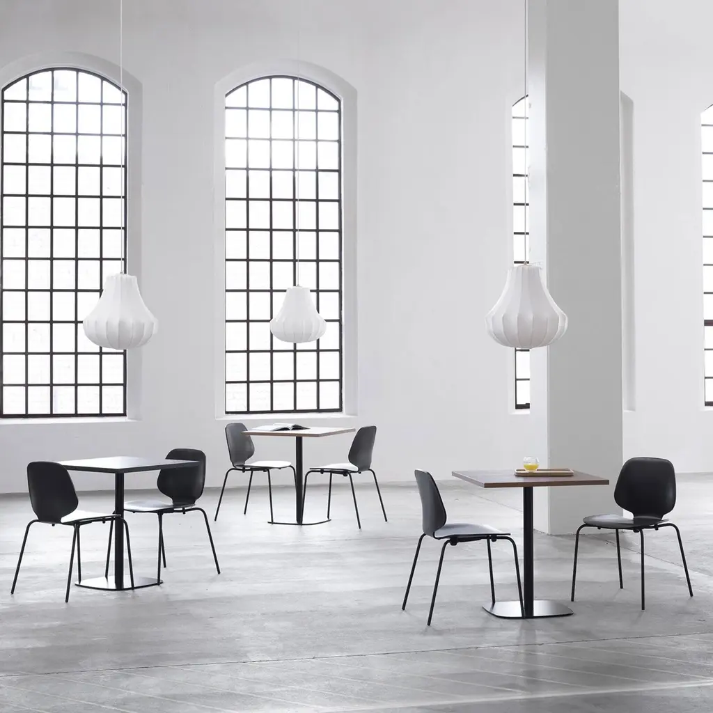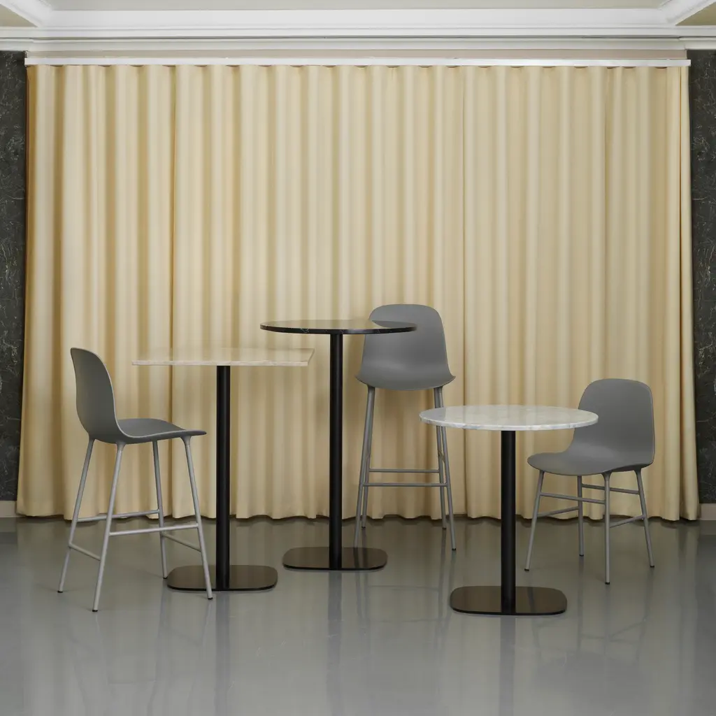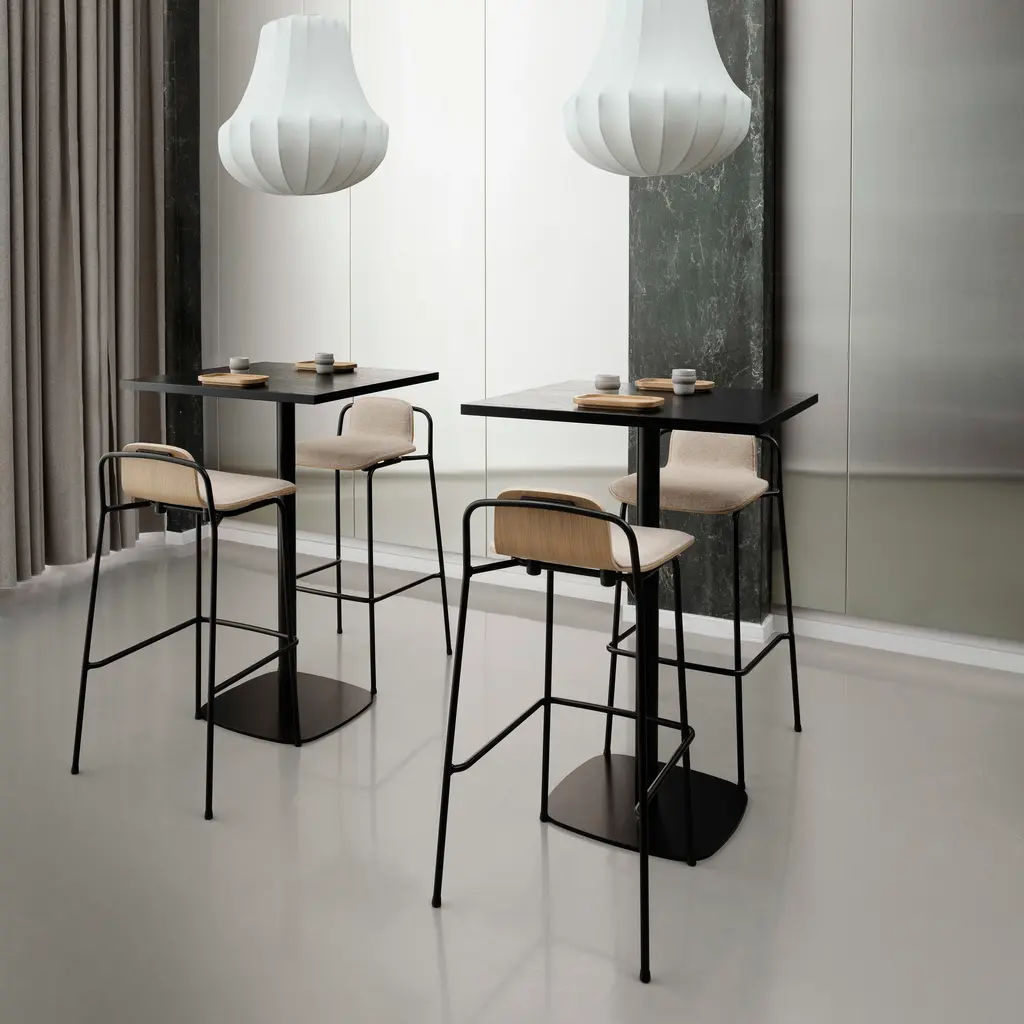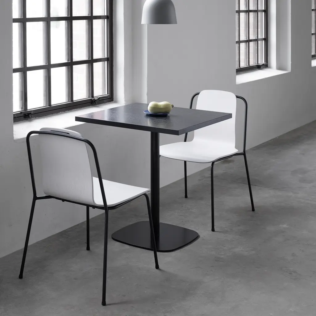 This smart square-top cafe table takes its place alongside SImon Legald’s notable Form seating. With a centered black steel base, the design shows its versatility, accommodating tabletop choices in lacquered wood grain, steel, solid black or the luxury of solid marble in coffee and sand tones. And it is available in 4 different heights—lounge, dining, counter or bar—to pair with its companion chair or stool.