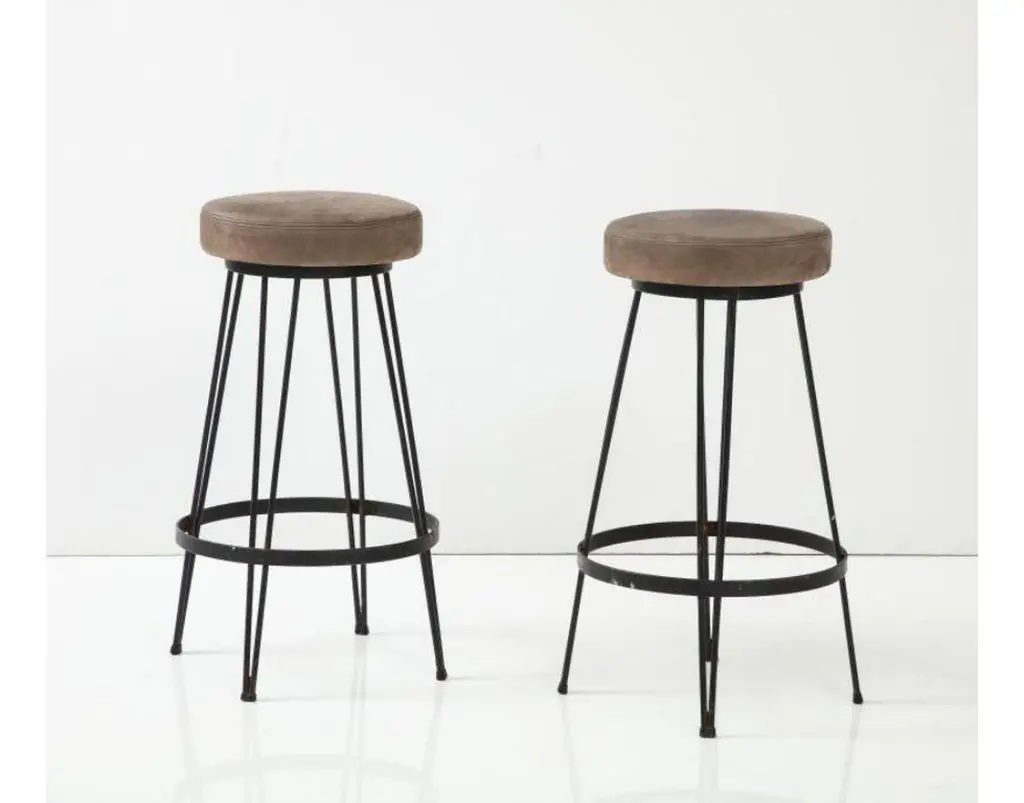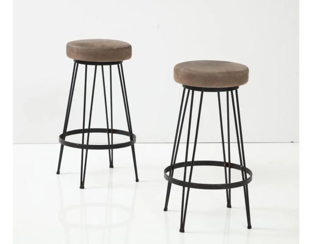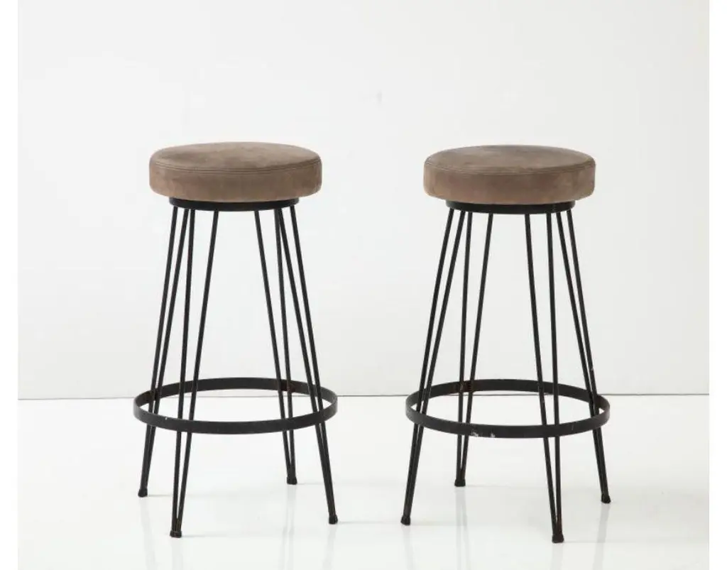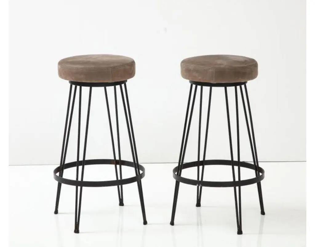 French Industrial Wrought Iron Counter Stools with Nubuck Upholstery, c. 1960Graphic wrought iron stools; at once industrial and refined.