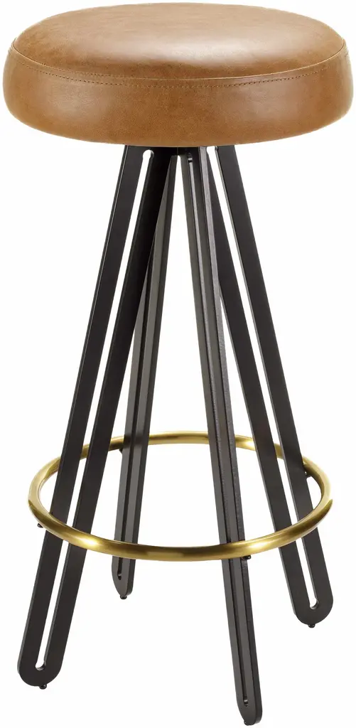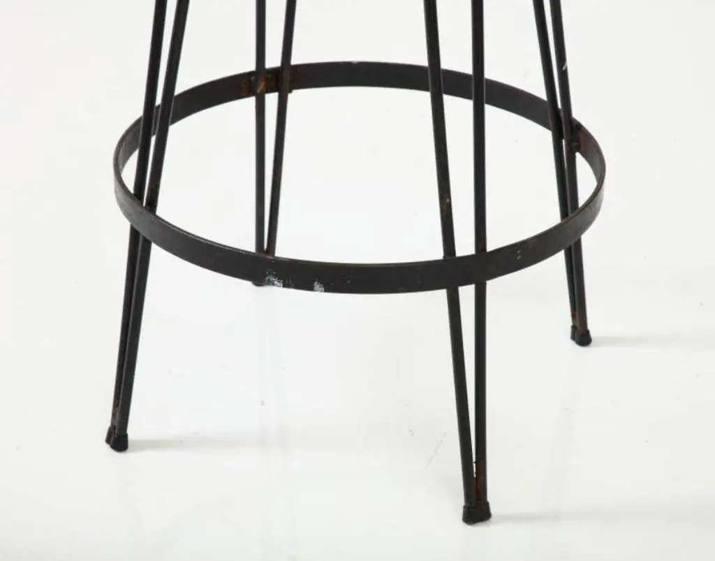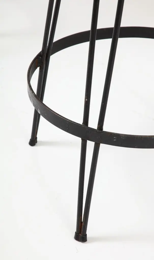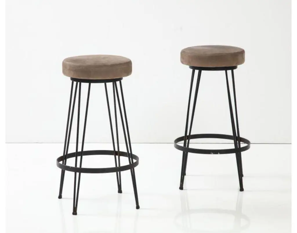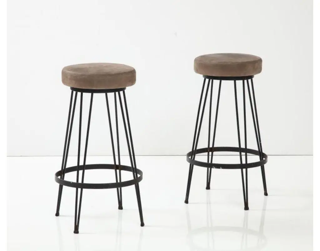 French Industrial Wrought Iron Counter Stools with Nubuck Upholstery, c. 1960Graphic wrought iron stools; at once industrial and refined.