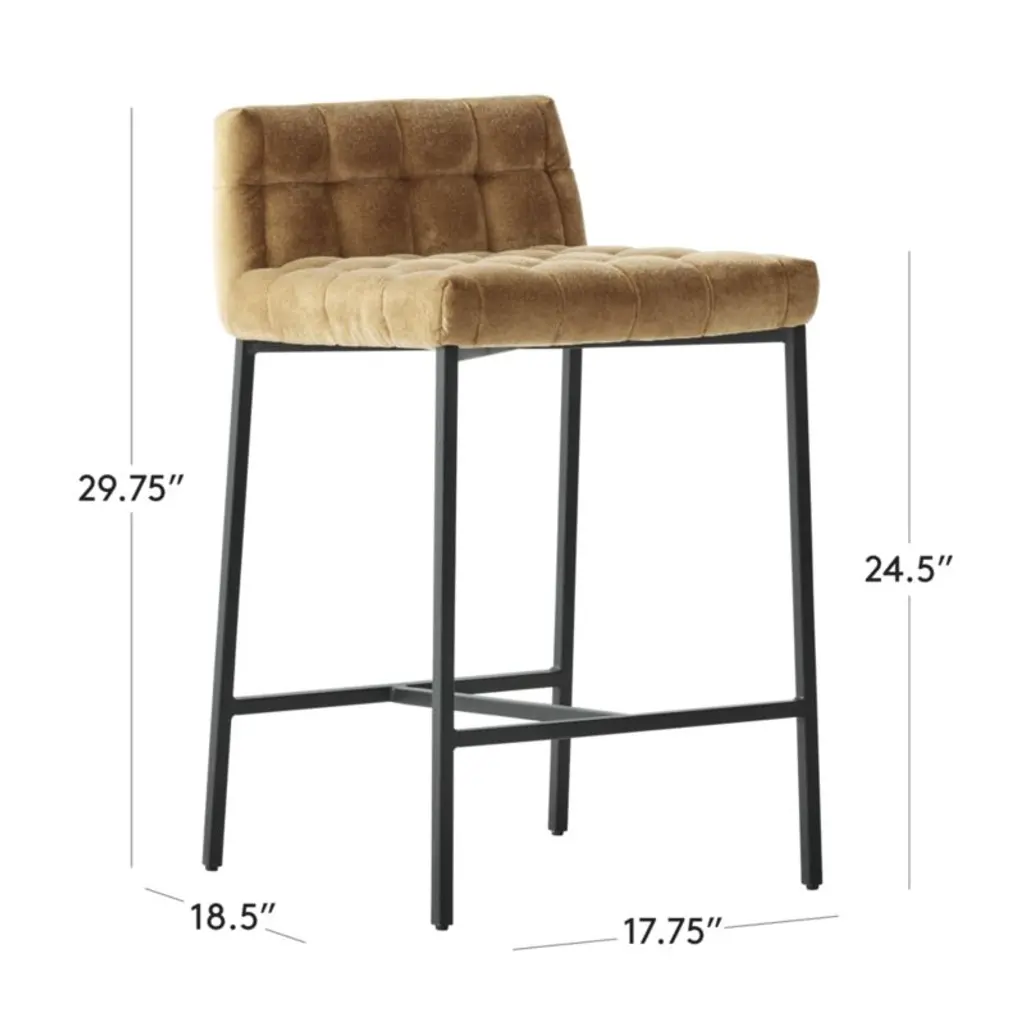 Jannis Ellenberger pairs a clean iron rod frame with a low back and tufted seat for this chic counter stool. Rich gold fabric is flecked with natural tones for a subtly luxe detail that adds visual interest. Ideal for kitchen island seating. CB2 exclusive.