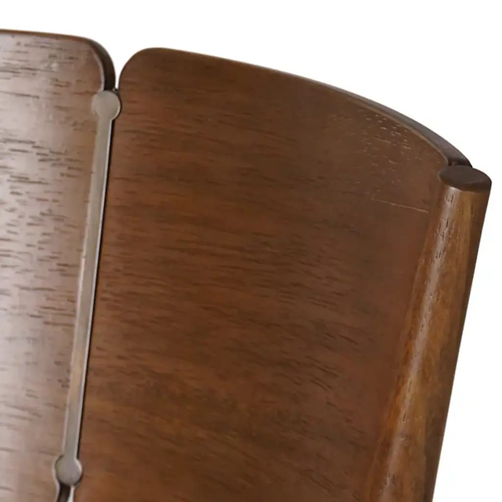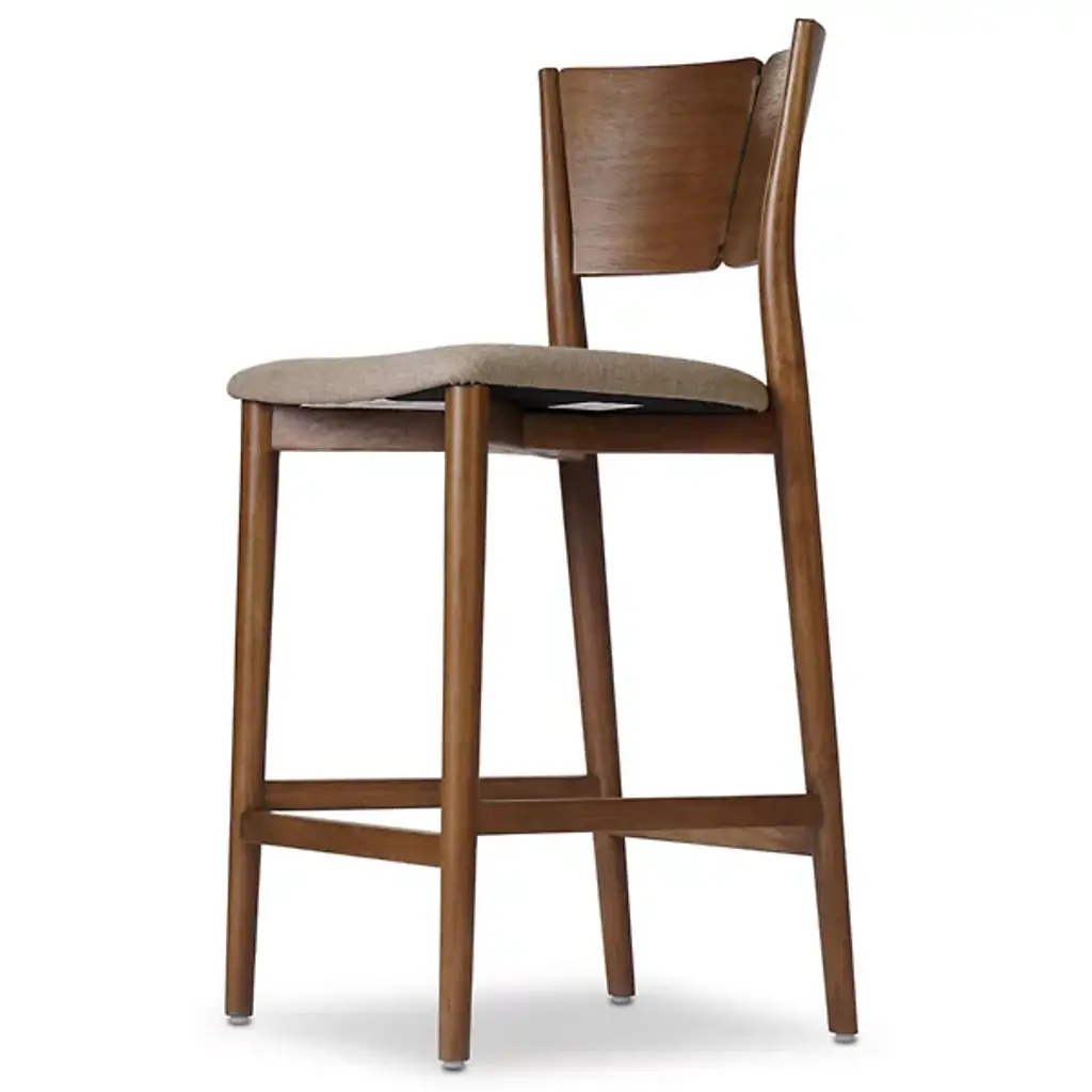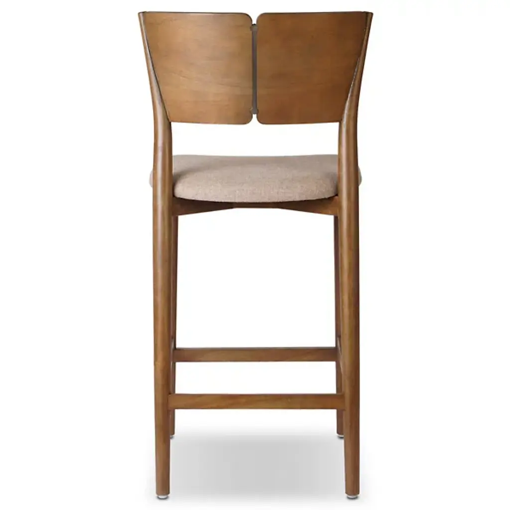 The Grady Counter Stool from Four Hands splits the backrest into two curved sections separated by a thin metal inlay that adds linear contrast to the warm parawood frame. The bentwood construction creates flowing lines from seat to back while maintaining structural integrity through careful steam-bending techniques. A thin seat cushion provides comfort without adding bulk to the clean profile. The rich finish allows the parawood's natural grain to show through while the metal detail introduces an industrial element to the Scandinavian-inspired form.