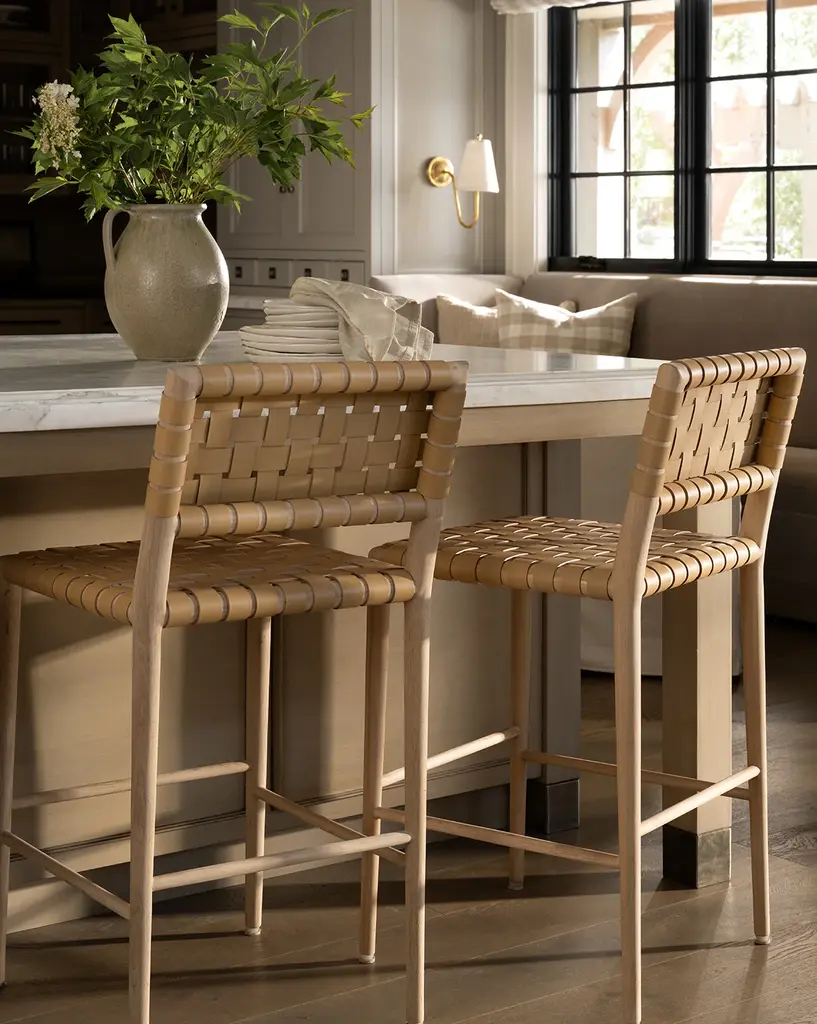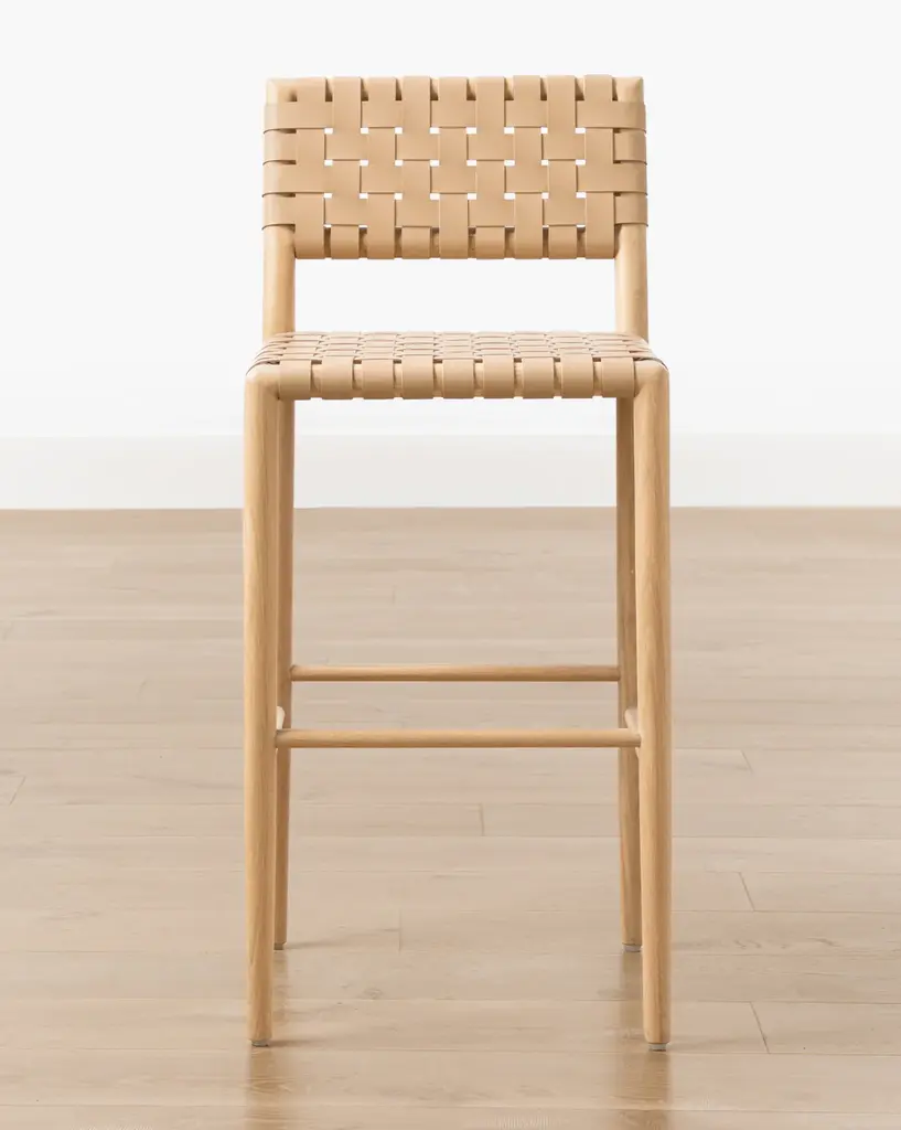 Expertly crafted with acute attention to detail, we designed the Greely Stool with a light and airy, yet sophisticated feel. Woven with aniline dyed leather wrapped around a solid white oak frame featuring slightly tapered legs, these woven counter stools instantly elevate your kitchen space with their modern, streamlined silhouette.