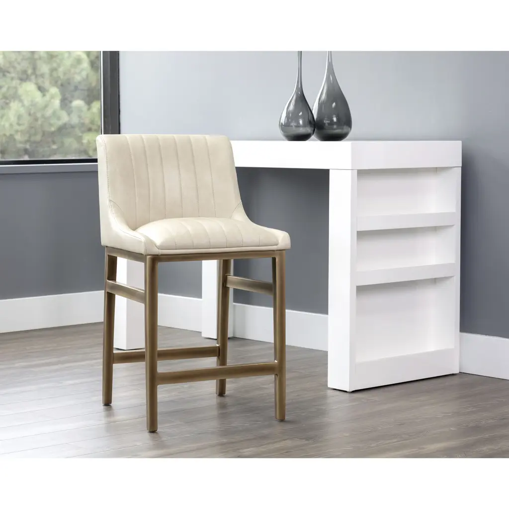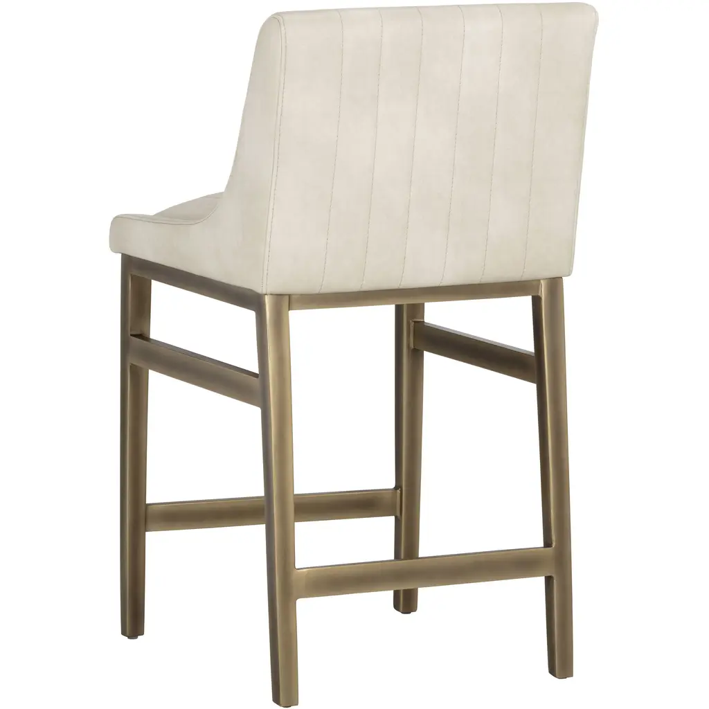 An urban designed stool featuring bold vertical channel tufting on the seat and back in bravo cream faux leather. Finished with a rustic bronze steel frame and stretchers. Great for residential and commercial placements. Suitable for various dining, kitchen and bar spaces of all sizes. Handle With Care: This design has been crafted with faux leather. Faux leather is manufactured to reflect the natural characteristics of leather as such, colour variations, markings, wrinkles, grooves, and light scratches are appreciated characteristics. No two pieces will be alike. Visit our Product Care page for more information on how to ensure the lasting beauty of this piece.